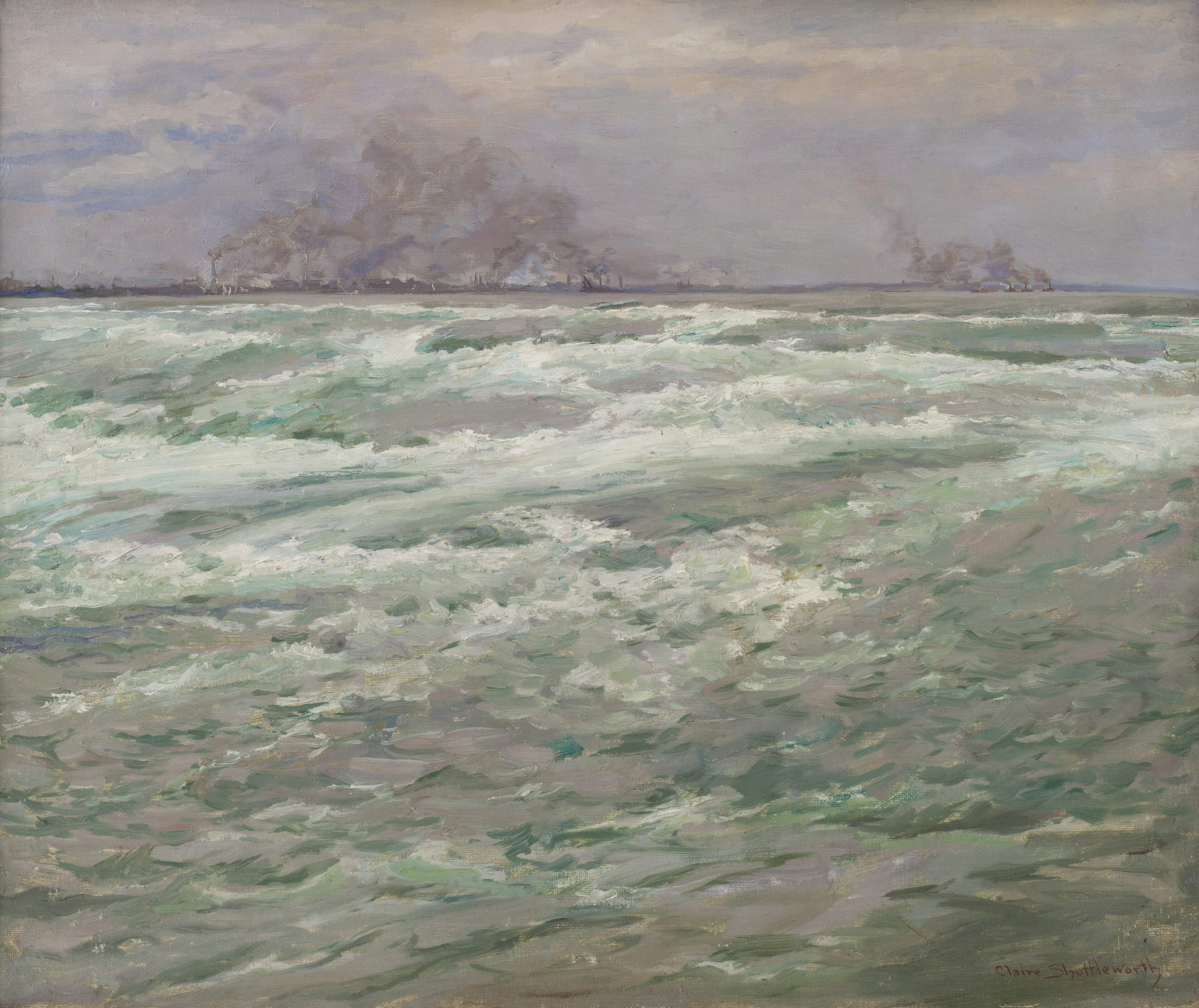 The distant smoke depicted in this painting would have been rising from the Hooker Electrochemical Company in Niagara Falls, which started operation in 1906. During World War I, the facility produced large amounts of monochlorobenzol and picric acid which were used to make explosives for the military. Hooker was purchased by the company now called OxyChem in 1968. Dumping of waste by Hooker was the cause of the Love Canal crisis which emerged in 1976.