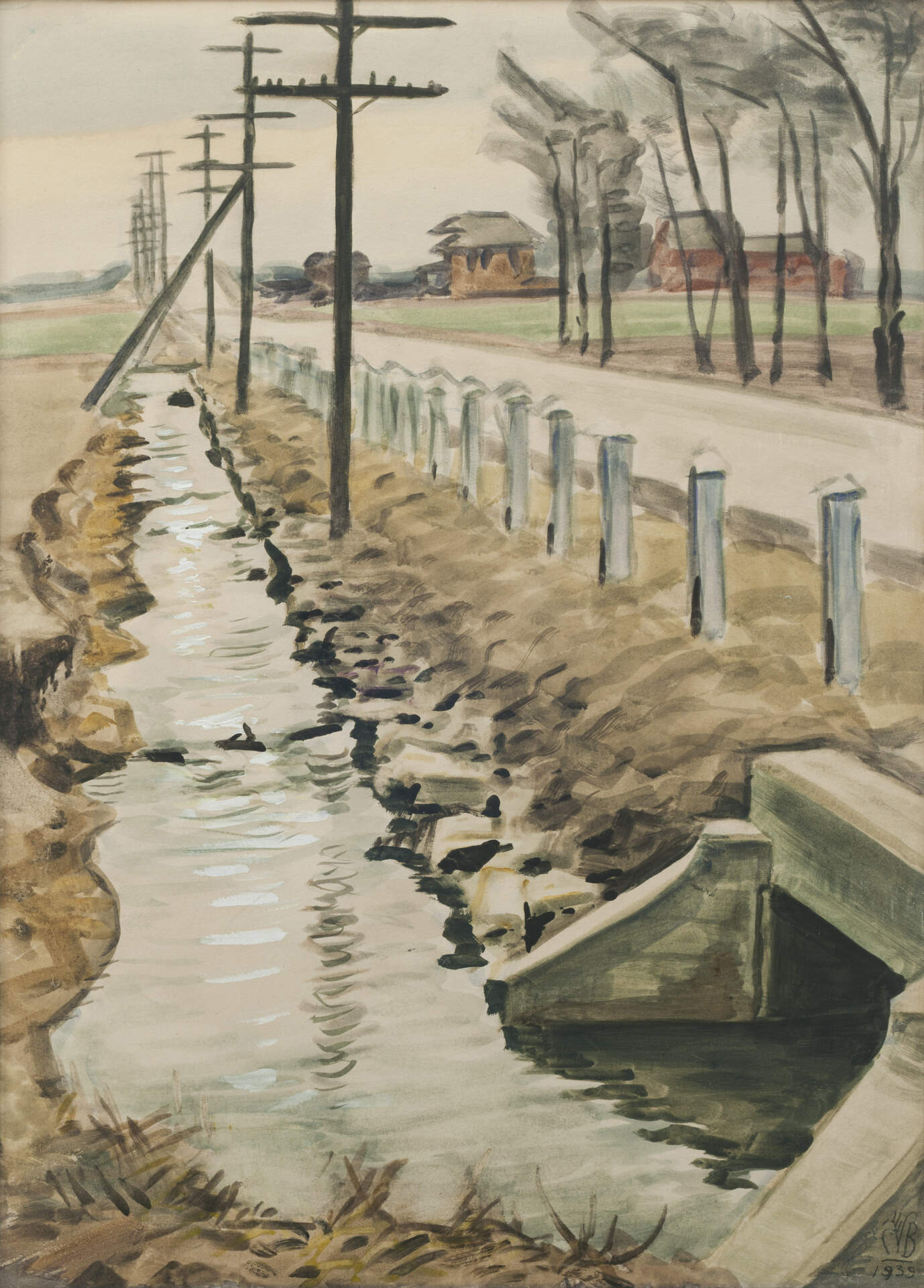 Using one-point perspective, Burchfield draws your eye down the stream. His geometry is echoed in a line of telephone poles and rows of protective road posts and roadside trees. Muted colors suggest the time of year when the spring sun and rains are just beginning to stir new growth.—NW