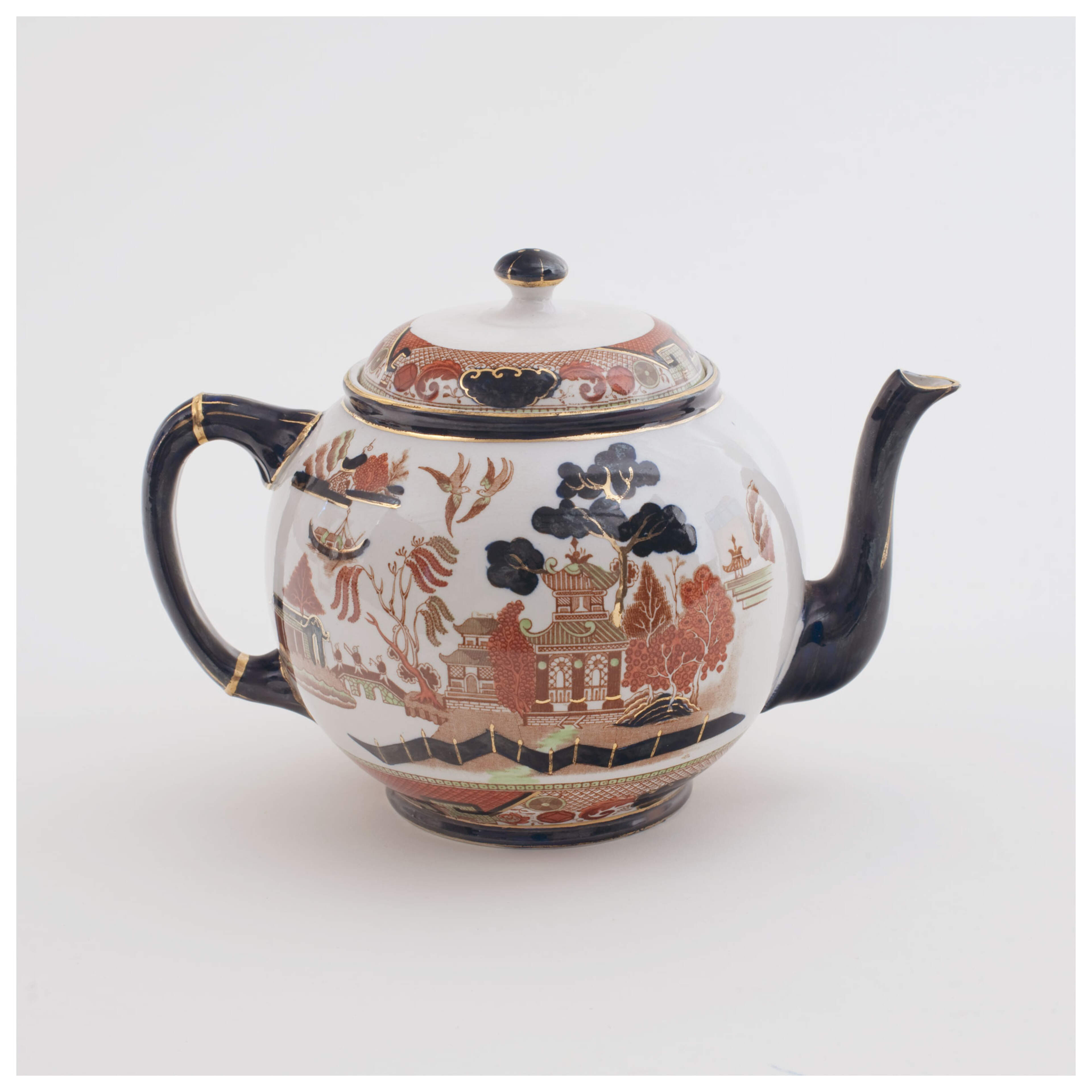 Glazed porcelain with underglaze design in dark blue, red, coral, light green, and brown with gold luster detail