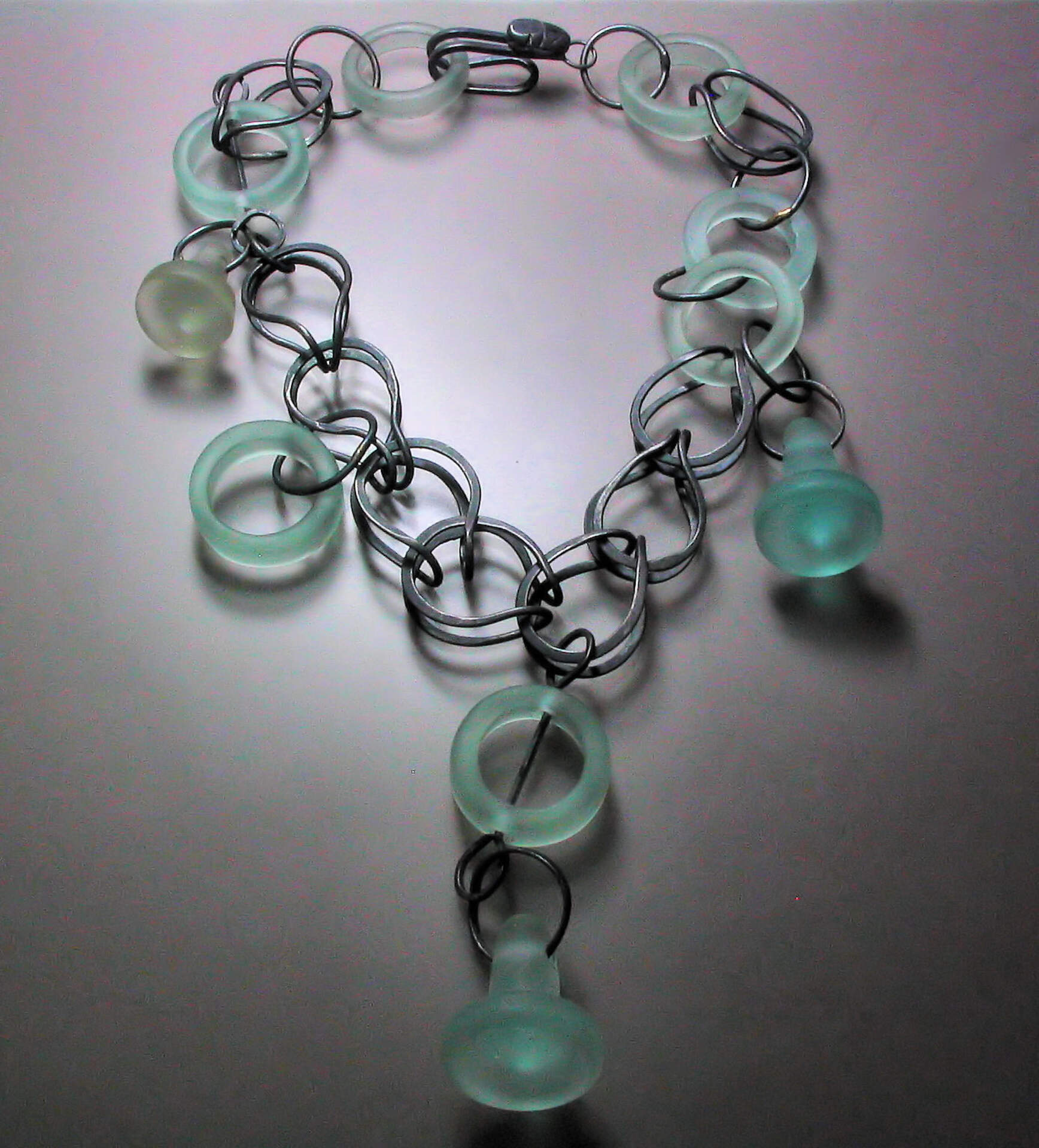 glass rings from recycled Pinot Grigio bottles, antique glass bottle stoppers from the English Channel and forged and oxidized sterling silver