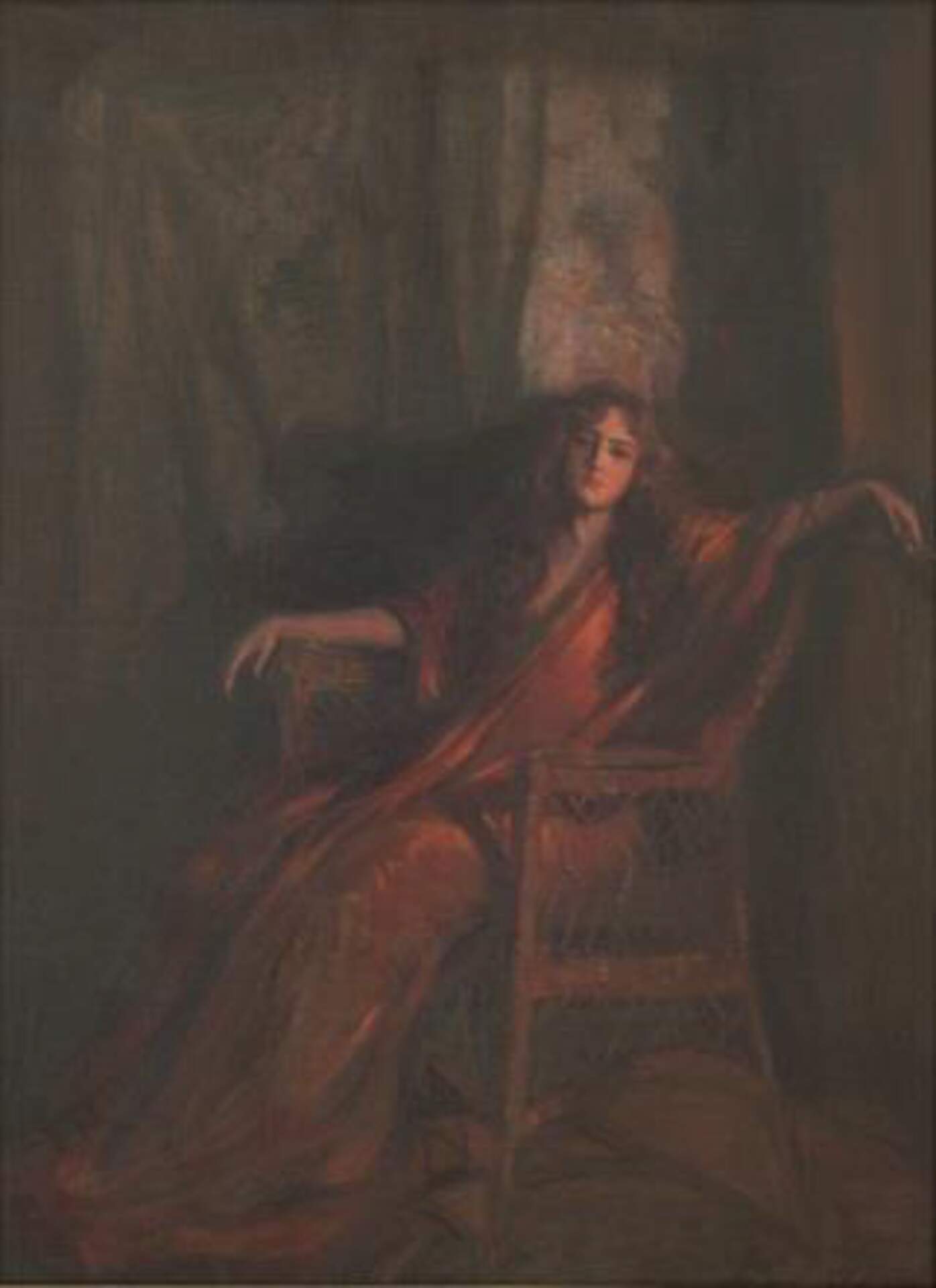 Untitled (Woman in red dress and shawl, seated in wicker chair with cigarette)