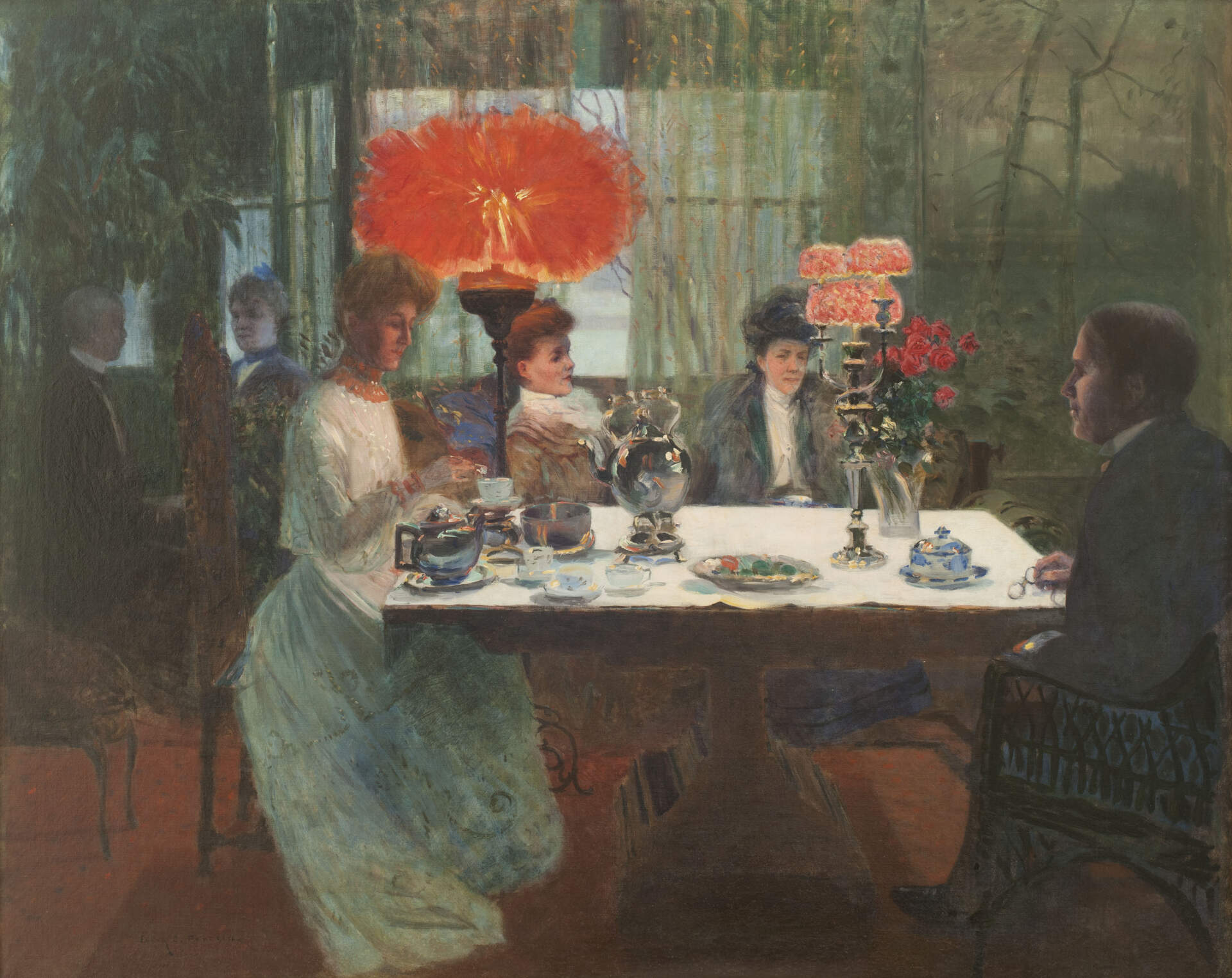 According to the seller and auction house (The Saleroom, Penzance, Cornwall, Great Britain, auction date 25 Jan 2018), the painting had been "Exhibited in March 1902 at the Buffalo Society of Artists. Six notable members of Buffalo society take tea in the Artist's studio. From left to right: The artist Burr H. Nicholls conversing with Mrs. Penfold, the artist's wife; Mrs. George Howard Bush presiding over the tea urn; Miss Emily Gray; Mrs. Edwin Fleming and Mr. George Hibbard the writer, on the extreme left. Provenance, from the estate of Major Charles St. John Colthurst (1904-1985) whose mother, Emma Susan Uebelher, was from Buffalo, New York; thence by family decent to the present vendor. Being sold with the painting is a pair of lorgnettes. Family legend has it that these are the same pair being held by Mr. Hibbard in the picture.