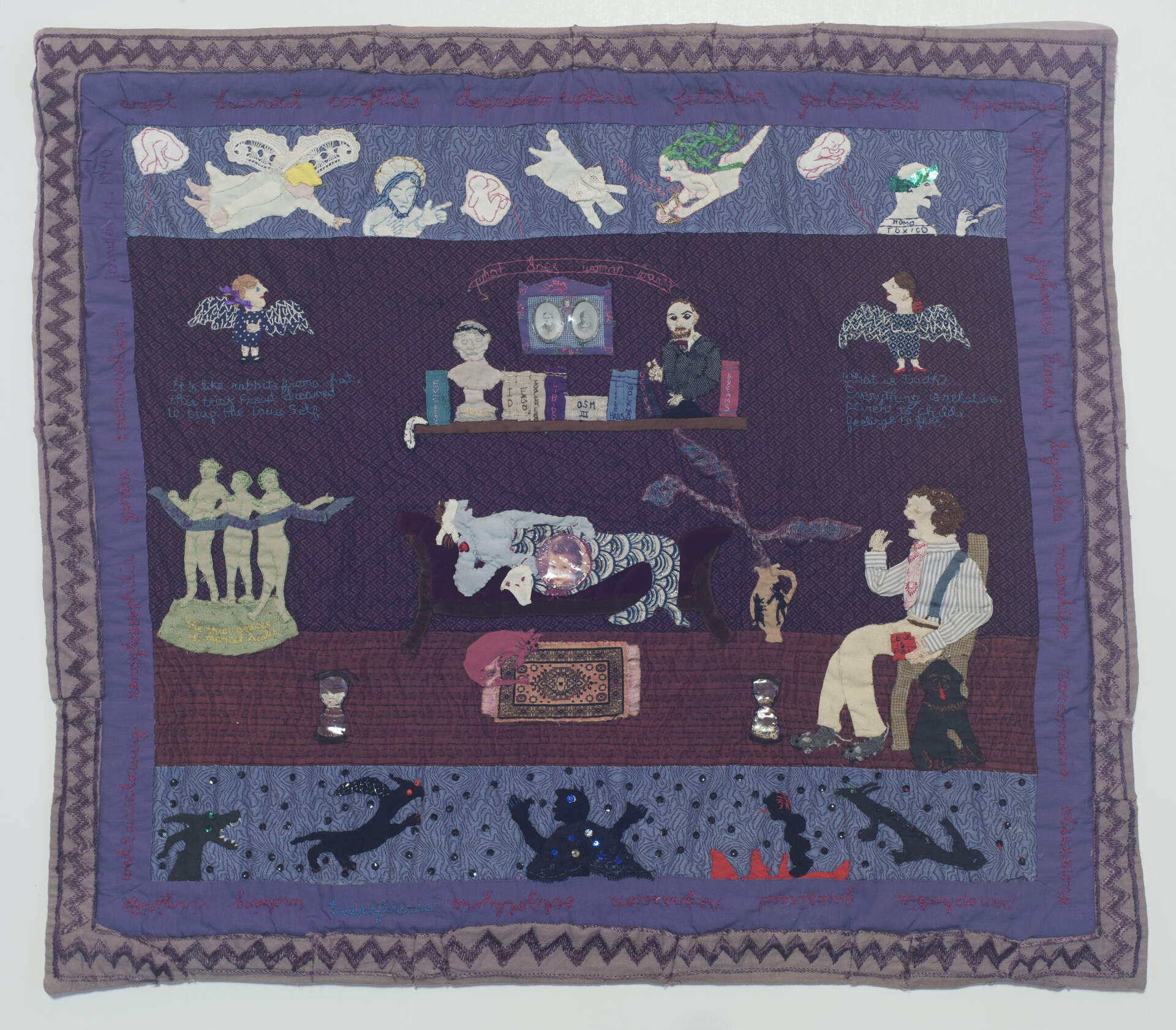Quilts usually offer comfort and warmth to those they cover; but when they act as a banner of personal issues, they can do the opposite. Jennifer Regan confronts difficult private issues in her life in a unique way. She symbolizes the hardships she has endured in the imagery of this quilt. The quilt offers comfort to the artist as an expressive outlet; but could bring about discomfort to the viewer. As a glimpse into very personal moments of the artist's life, the quilt also portrays universal issues society should address.