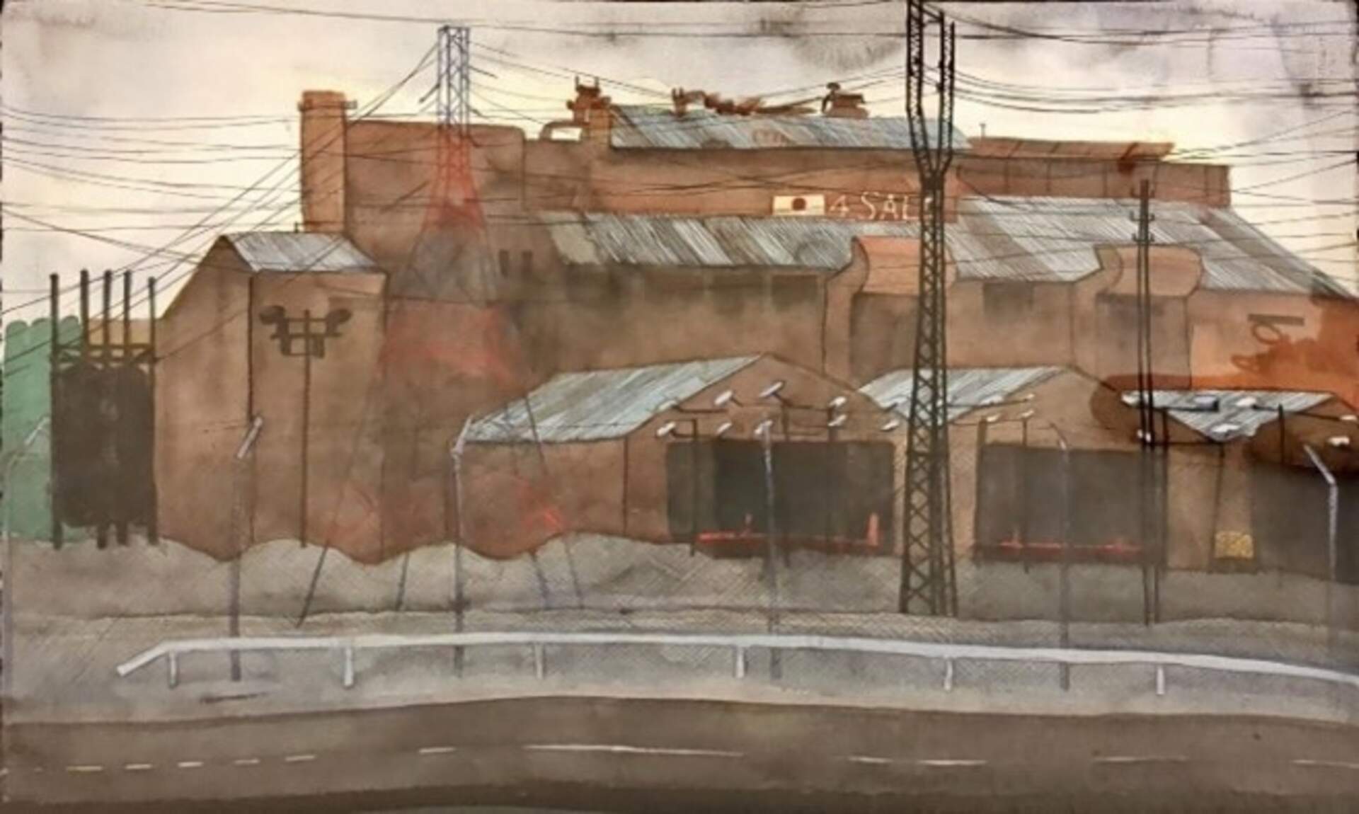 "4 Sale depicts a Bethlehem Steel plant in Lackawanna about to shut down, and so the steelworkers climbed up to that top story and painted roughly on it, “4 sale.” It is part of [my Post-Industrial Steel Town Series (PIST)] in Buffalo’s major steel producing area."