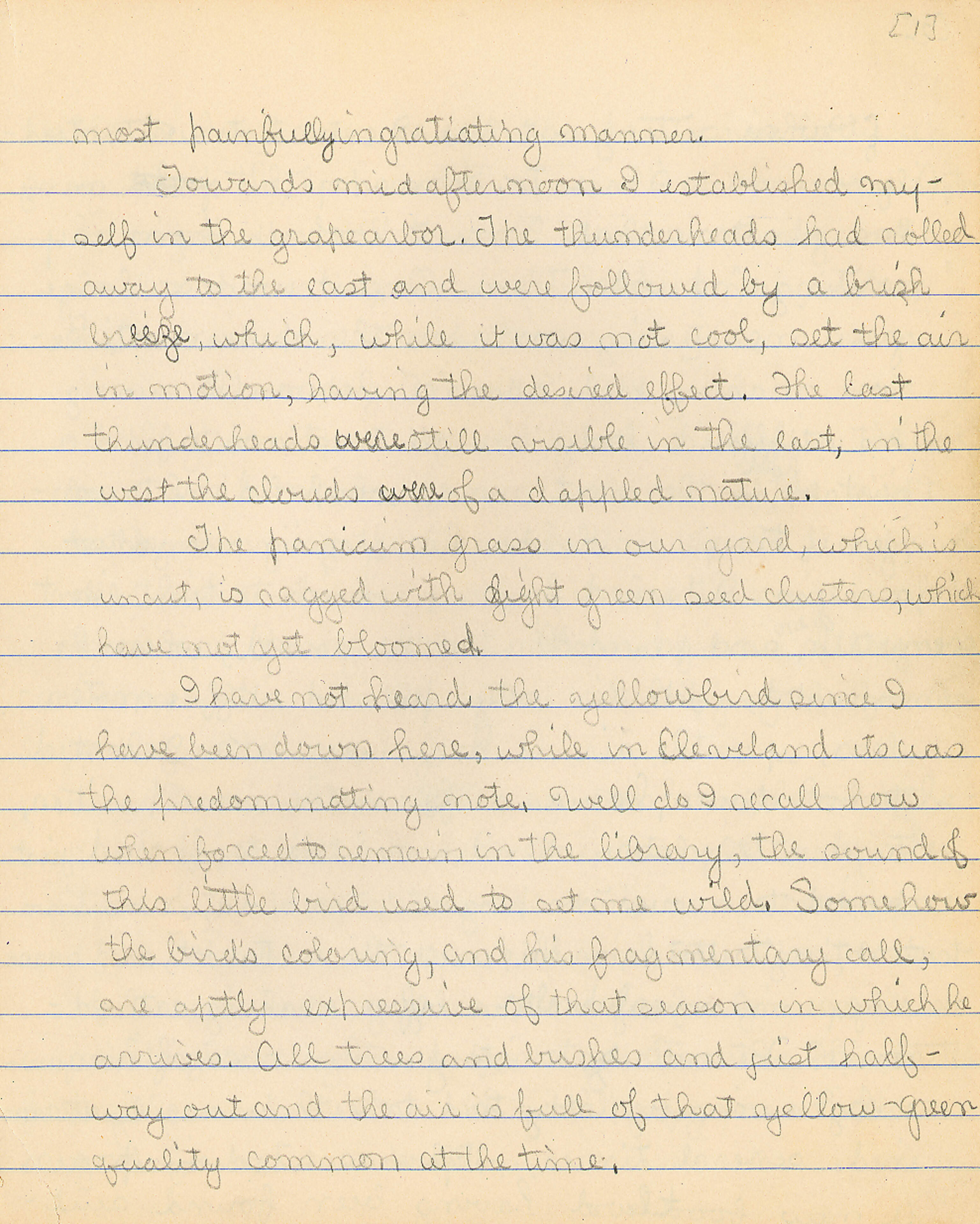 [...] most painfully ingratiating manner. Towards mid afternoon I established myself in the grape arbor. The thunderheads had rolled away to the east and were followed by a brisk breeze, which, while it was not cool, set the air in motion, having the desired effect. The last thunderheads were still visible in the east, in the west the clouds were of a dappled nature.(HT)The panicum grass in our yard, which is uncut, is ragged with light green seed clusters, which have not yet bloomed.(HT)I have not heard the yellowbird since I have been down here, while in Cleveland it was the predominating note. Well do I call recall how when forced to remain in the library, the sound of this bird used to set me wild. Somehow the bird’s coloring, and his fragmentary call, are aptly expressive of that season in which he arrives. All trees and bushes and just halfway out and the air is full of that yellow-green quality common at the time.