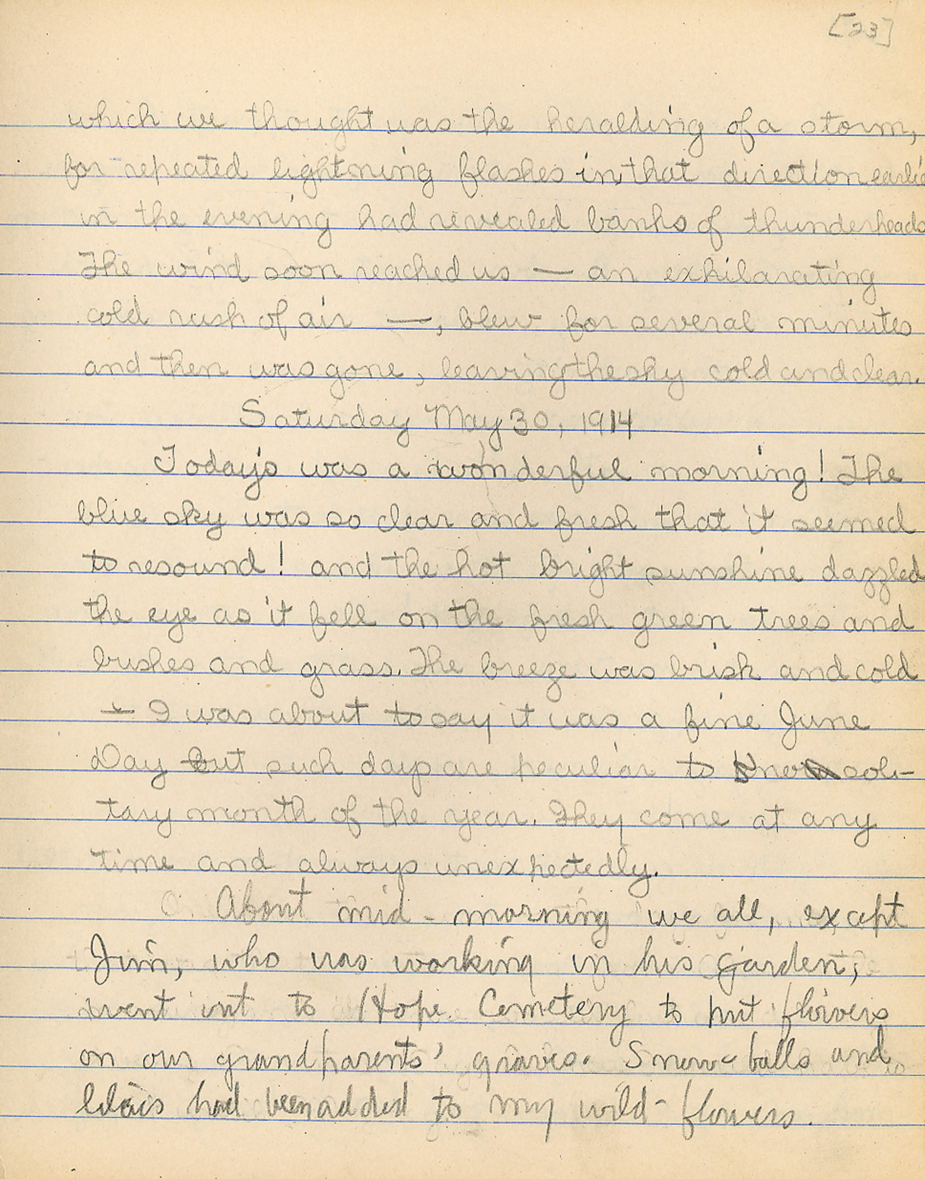 which we thought was the heralding of a storm, for repeated lightning flashes in that direction earlier in the evening had revealed banks of thunderheads. The wind soon reached us – an exhilarating cold rush of air -, blew for several minutes and then was gone, leaving the sky cold and clear.(HT)(HT)(HT)(HT)Saturday May 30, 1914(HT)Today’s was a wonderful morning! The blue sky was so clear and fresh that it seemed to resound! and the hot bright sunshine dazzled the eye as it fell on the fresh green trees and bushes and grass. The breeze was brisk and cold – I was about to say it was a fine June Day but such days are peculiar to no solitary month of the year. They come at any time and always unexpectedly.(HT)About mid-morning we all, except Jim, who was working in his garden, went into Hope Cemetery to put flowers on our grandparents’ graves. Snow-balls and lilacs had been added to my wild-flowers.