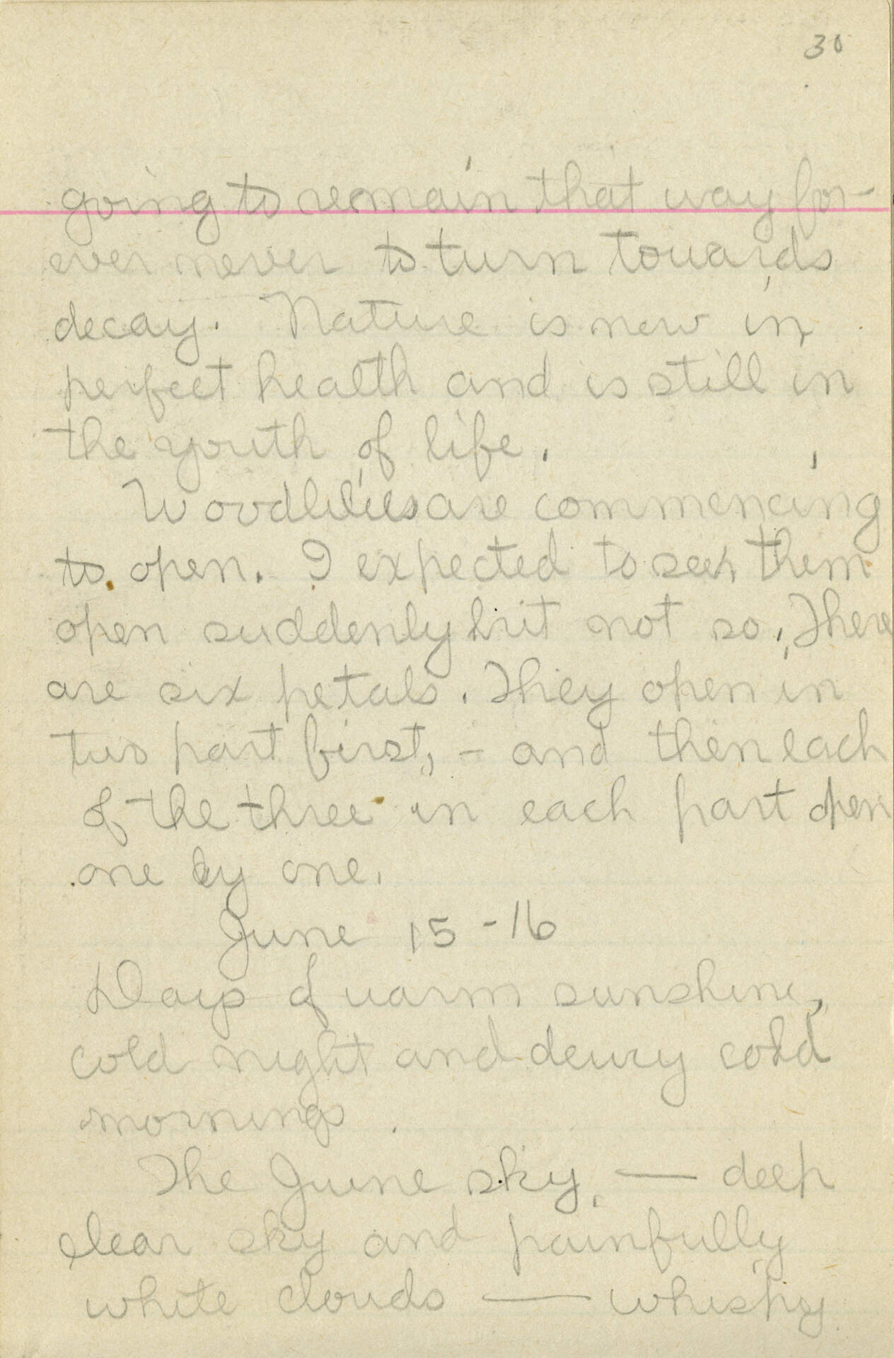going to remain that way forever never to turn towards decay. Nature is now in perfect health and is still in the youth of life.Woodlilies are commencing to open. I expected to see them open suddenly but not so. There are six petals. They open in two parts first - and then each of the three in each part open one by one.(HT)(HT)(HT)(HT)June 15 - 16Days of warm sunshine, cold night and dewy cold mornings.The June sky - deep clear sky and painfully white clouds - whispy
