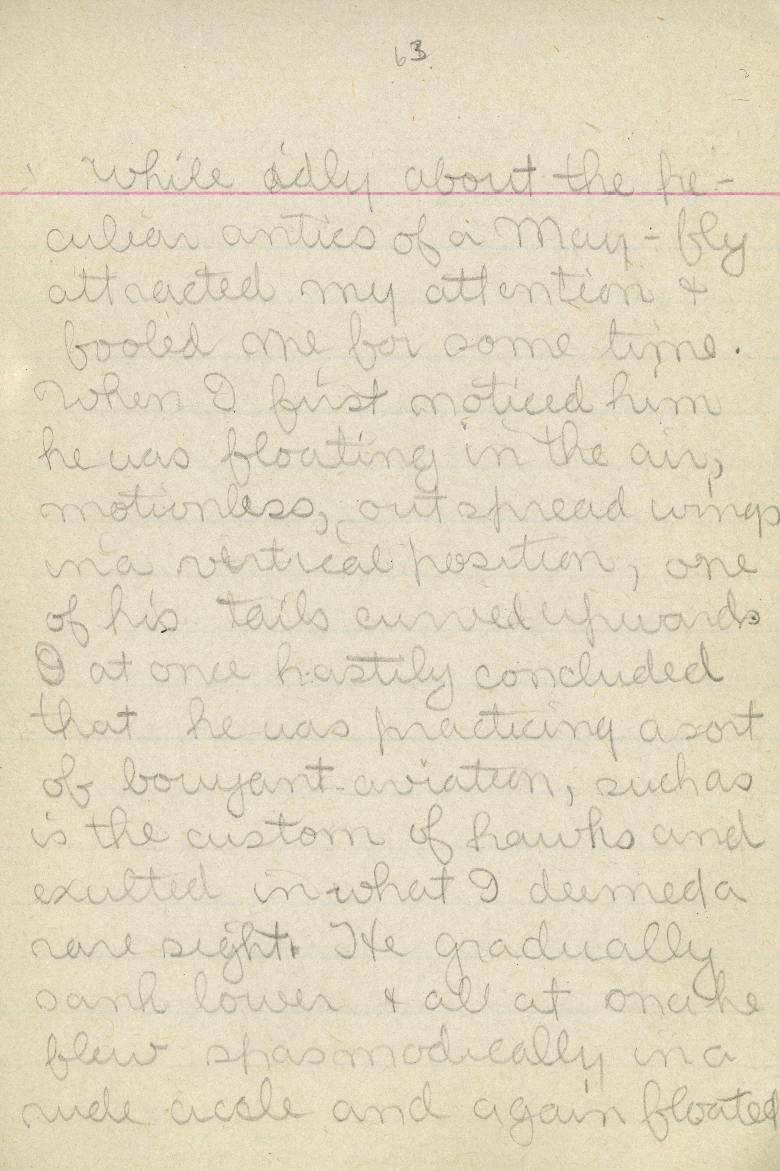 [inscription reads] " While idly about the peculiar antics of a May-fly attracted my attention & fooled me for some time. When I first noticed him he was floating in the air, motionless, outspread wings in a vertical position, one of his tails curved upwards. I at once hastily concluded that he was practicing a sort of buoyant aviation, such as is the custom of hawks and exulted in what I deemed a rare sight. He gradually sank lower & all at once he flew spasmodically in a rude circle and again floated "