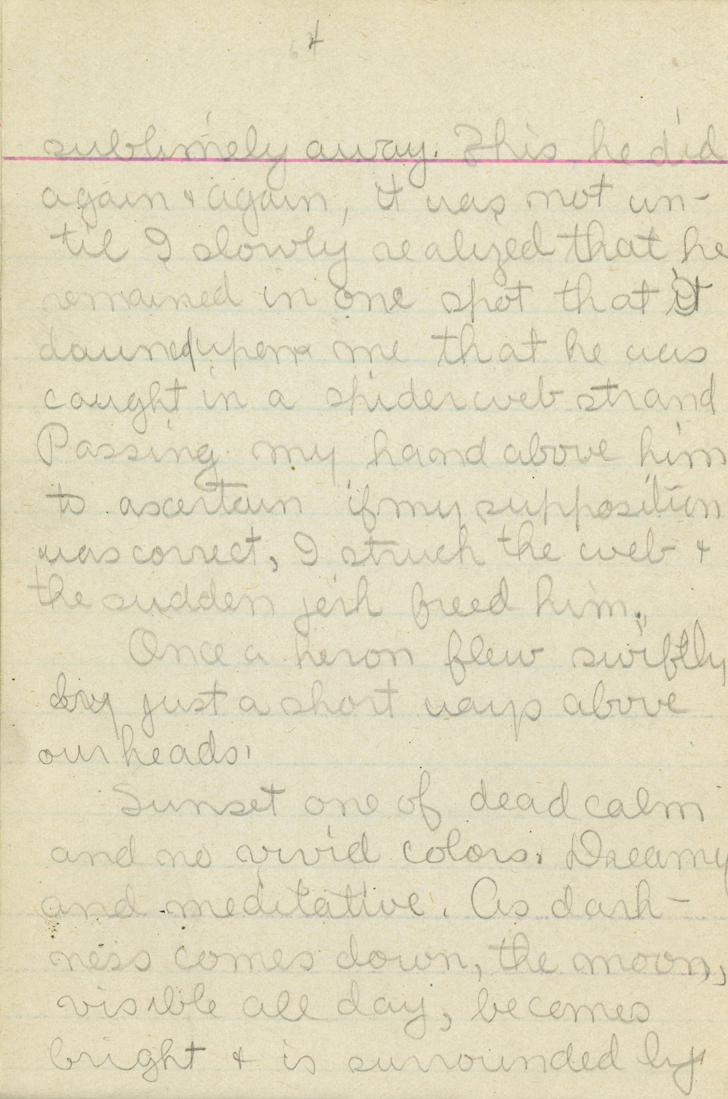 [inscription reads] " sublimely away. This he did again & again, it was not until I slowly realized that he remained in one spot that it dawned upon me that he was caught in a spiderweb strand Passing my hand above him to ascertain if my supposition was correct, I struck the web & the sudden jerk freed him. / Once a heron flew swiftly by just a short ways above our heads. / Sunset one of dead calm and no vivid colors. Dreamy and meditative. As darkness comes down, the moon, visible all day becomes bright & is surrounded by "