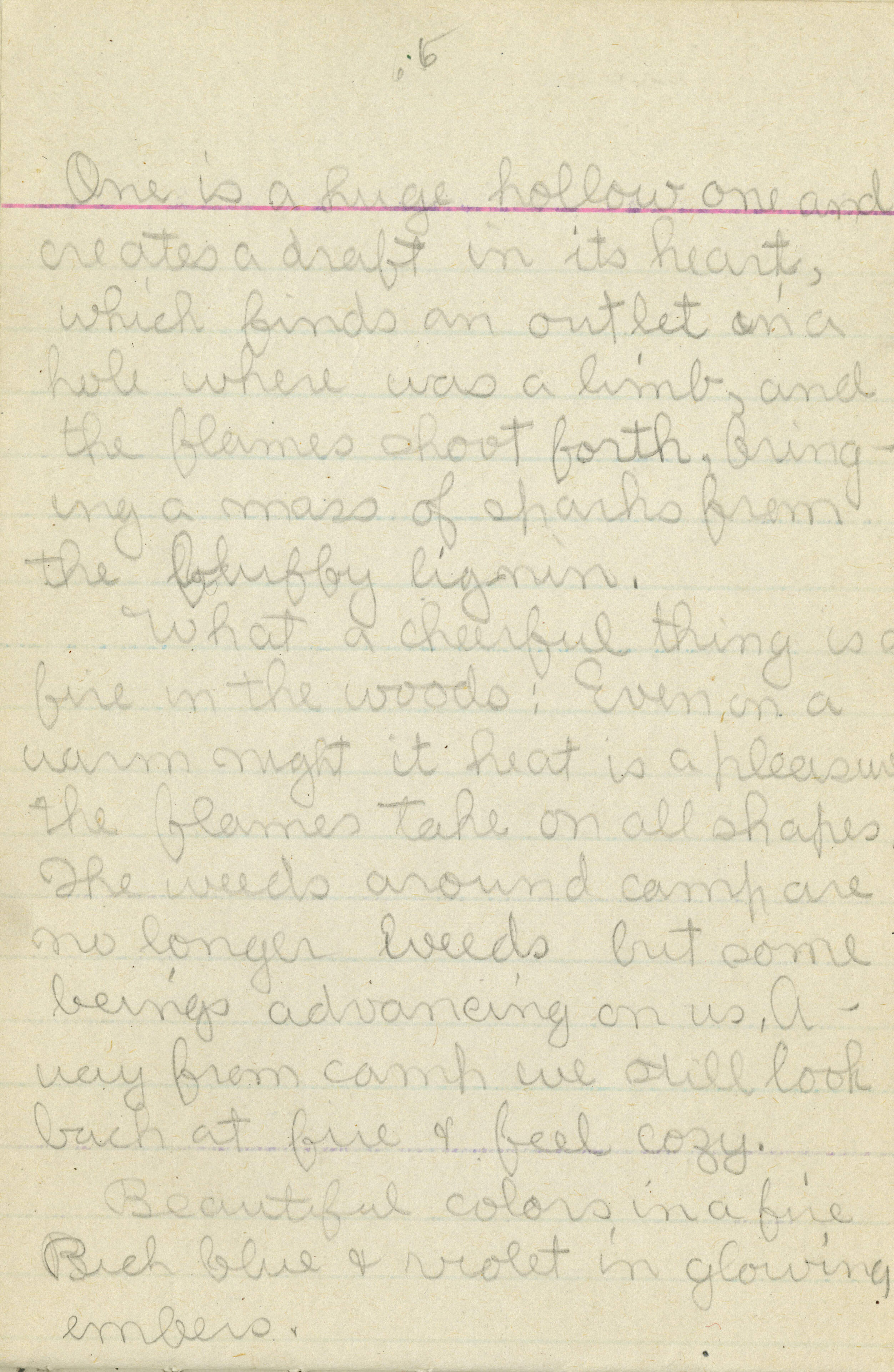 [inscription reads] " One is a huge hollow one and creates a draft in its heart, which finds an outlet in a hole where was a limb, and the flames shoot forth, bringing a mass of sparks from the fluffy lignin. / What a cheerful thing is a fire in the woods: Even on a warm night its heat is a pleasure; the flames take on all shapes. The weeds around camp are no longer weeds but some beings advancing on us. Away from camp we still look back at fire & feel cozy. / Beautiful colors in a fire. Rich blue & violet in glowing embers. "