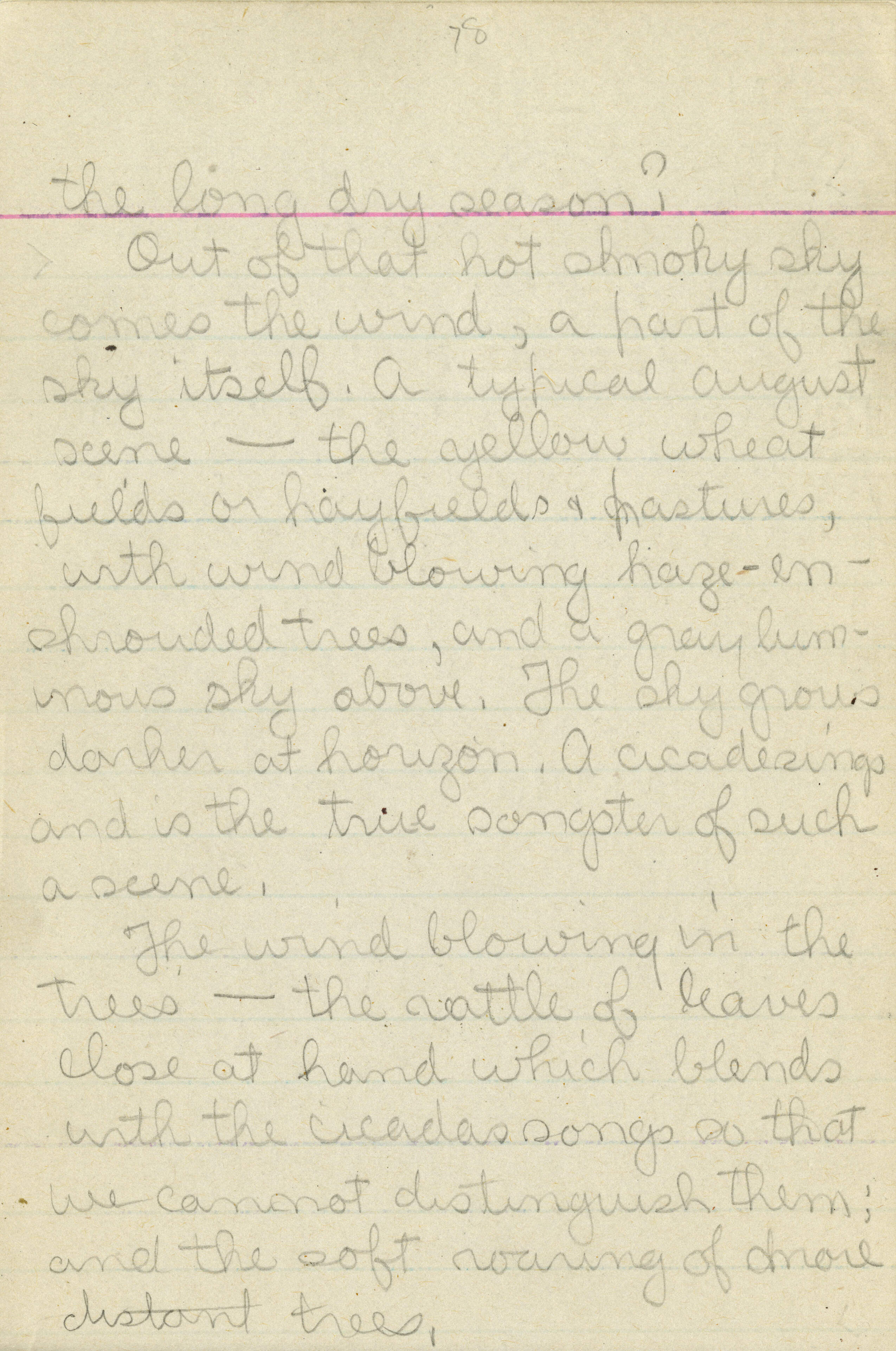 [inscription reads] " the long dry season? / Out of that hot smoky sky comes the wind, a part of the sky itself. A typical August scene – the yellow wheat fields or hayfields & pastures, with wind blowing haze-enshrouded trees, and a gray luminous sky above. The sky grows darker at horizon. A cicada sings and is the true songster of such a scene. / The wind blowing in the trees – the rattle of leaves close at hand which blends with the cicada songs so that we cannot distinguish them; and the soft roaring of more distant trees. "