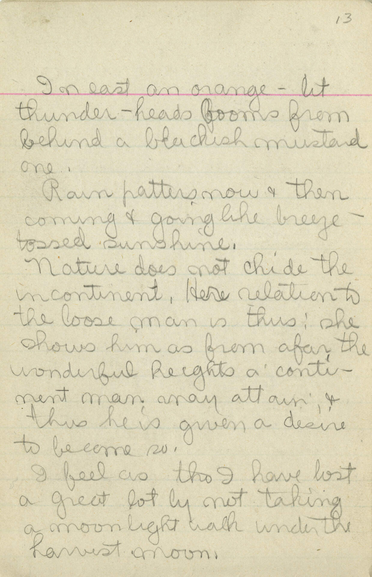 [inscription reads] " In east an orange-lit thunder-heads booms from behind a blackish mustard one. / Rain patters now & then coming & going like breeze-tossed sunshine. / Nature does not chide the incontinent. Her relation to the loose man is thus: she shows him as from afar the wonderful heights a continent man may attain & thus he is given a desire to become so. / I feel as tho (sic) I have lost a great lot by not taking a moon¬light walk under the harvest moon. "