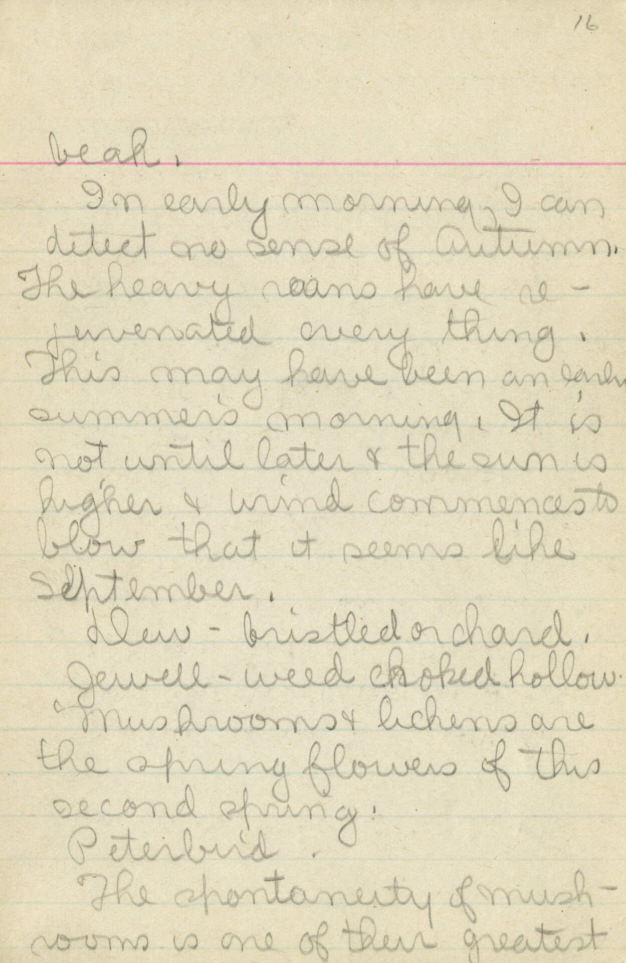 [inscription reads] " beak. / In early morning, I can detect no sense of Autumn. The heavy rains have rejuvenated everything. This may have been an early summer’s morning. It is not until later & the sun is higher & wind commences to blow that it seems like September. / Dew-bristled orchard. / Jewell-weed choked hollow. / Mushrooms & lichens are the spring flowers of this second spring. / Peterbird. / The spontaneity of mushrooms is one of their greatest "