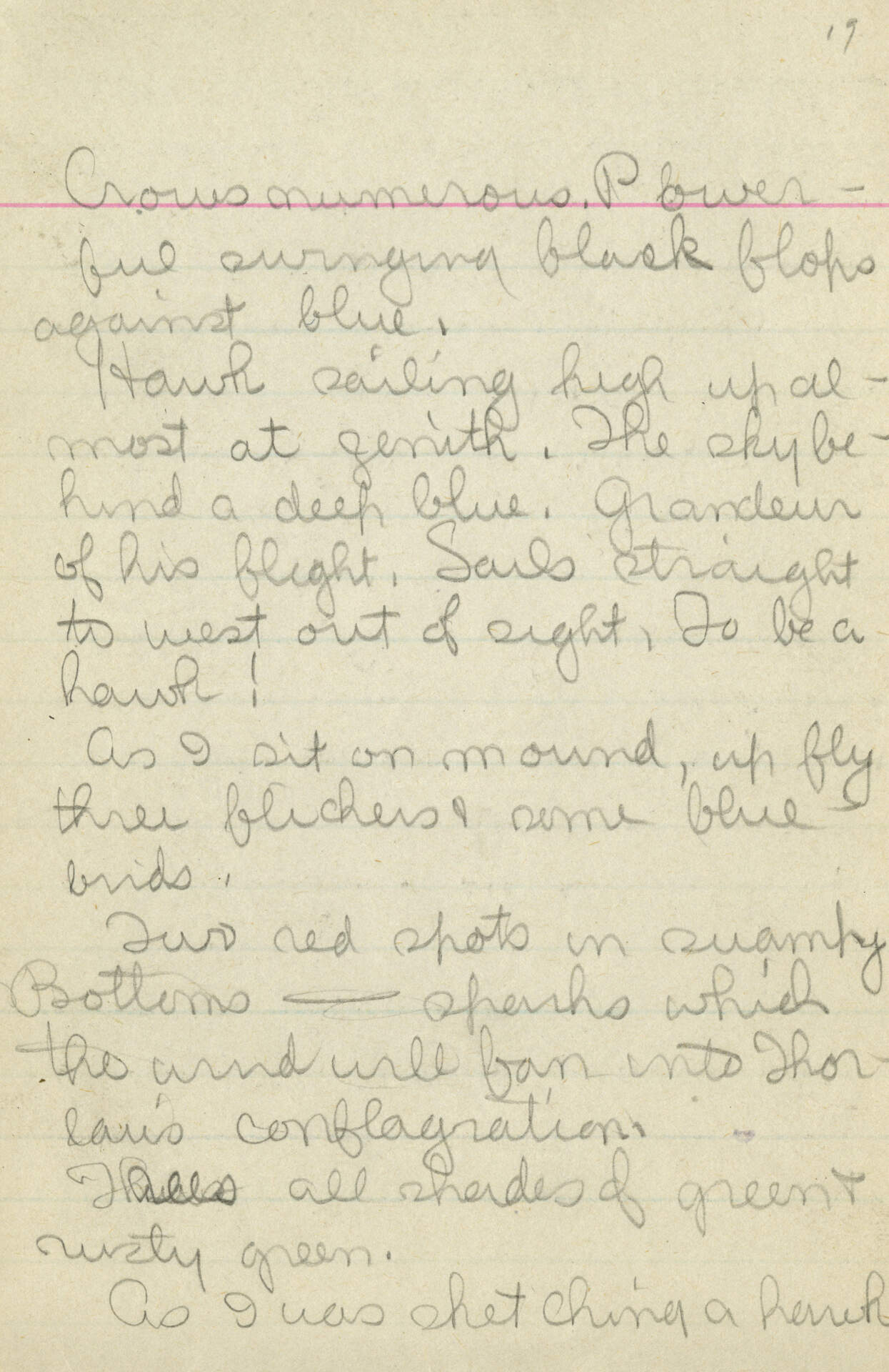 [inscription reads] " Crows numerous. Powerful swinging black flops against blue. / Hawk sailing high up almost at zenith. The sky behind a deep blue. Grandeur of his flight. Sails straight to west out of sight, To be a hawk! / As I sit on mound, up fly three flickers & some bluebirds. / Two red spots in swampy Bottoms - sparks which the wind will fan into Thoreau’s conflagration. / Trees all shades of green & rusty green. / As I was sketching a hawk "