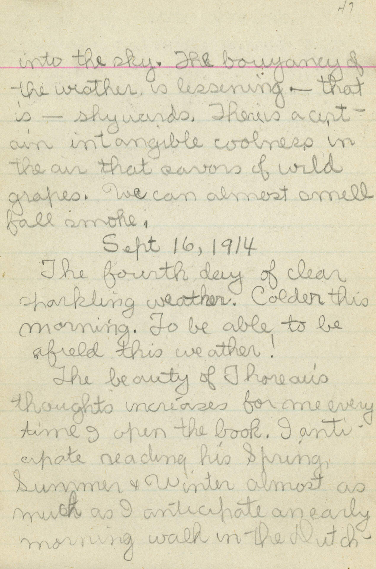 [inscription reads] " into the sky. The bouyancy (sic) of the weather is lessening - that is -- skywards. There is a certain intangible coolness in the air that savors of wild grapes. We can almost smell fall smoke. / Sept 16, 1914 / The fourth day of clear sparkling weather. Colder this morning. To be able to be afield this weather! / The beauty of Thoreau’s thoughts increases for me every time I open the book. I anticipate reading his Spring, Summer & Winter almost as much as I anticipate an early morning walk in the Dutch- "