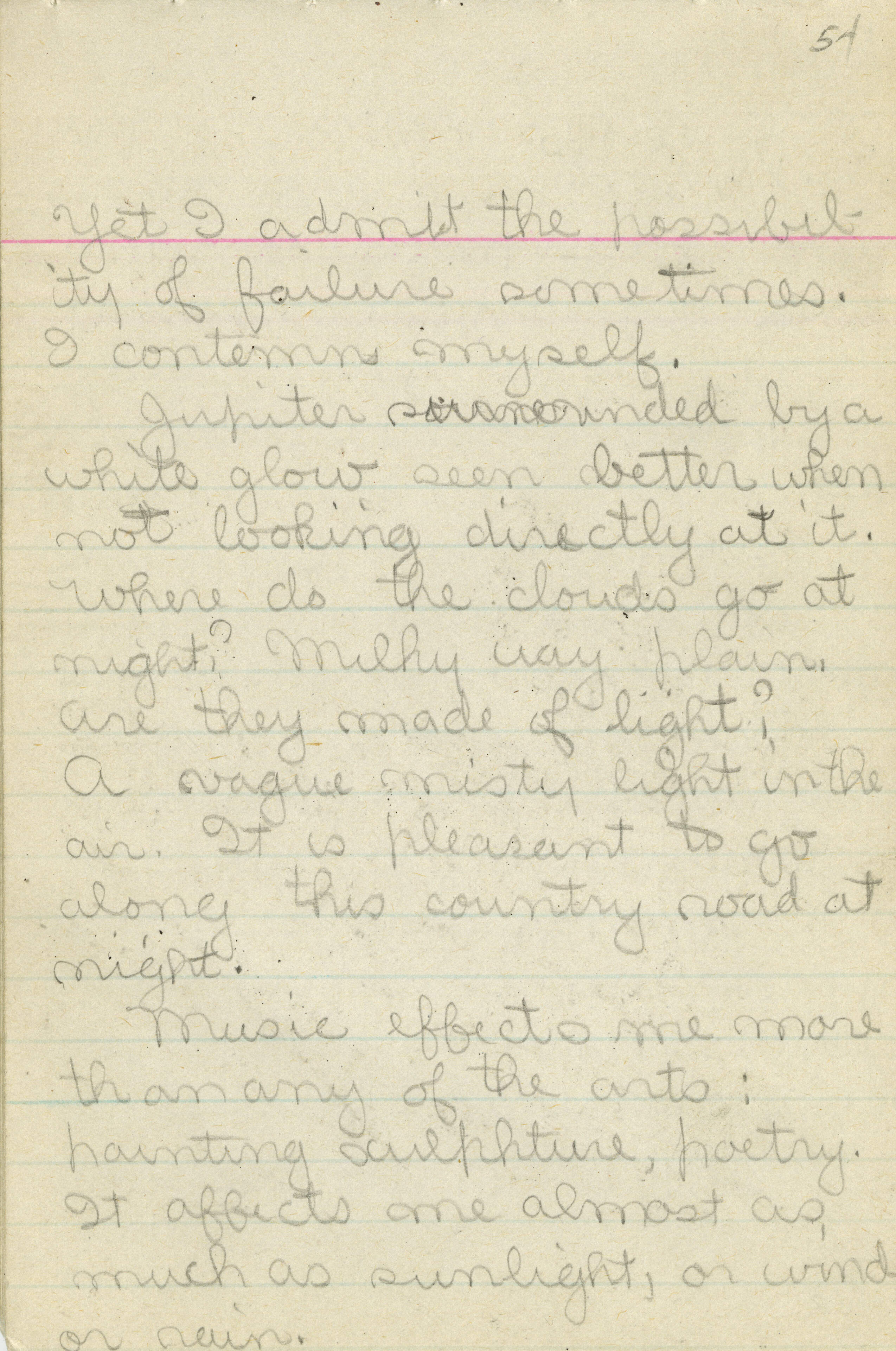 [inscription reads] " yet I admit the possibility of failure sometimes. I contemn myself. / Jupiter surrounded by a white glow seen better when not looking directly at it. Where do the clouds go at night? Milky Way plain. Are they made of light? A vague misty light in the air. It is pleasant to go along this country road at night. / Music effects me more than any of the arts: painting, sculpture, poetry. It affects me almost as much as sunlight, or wind or rain. "