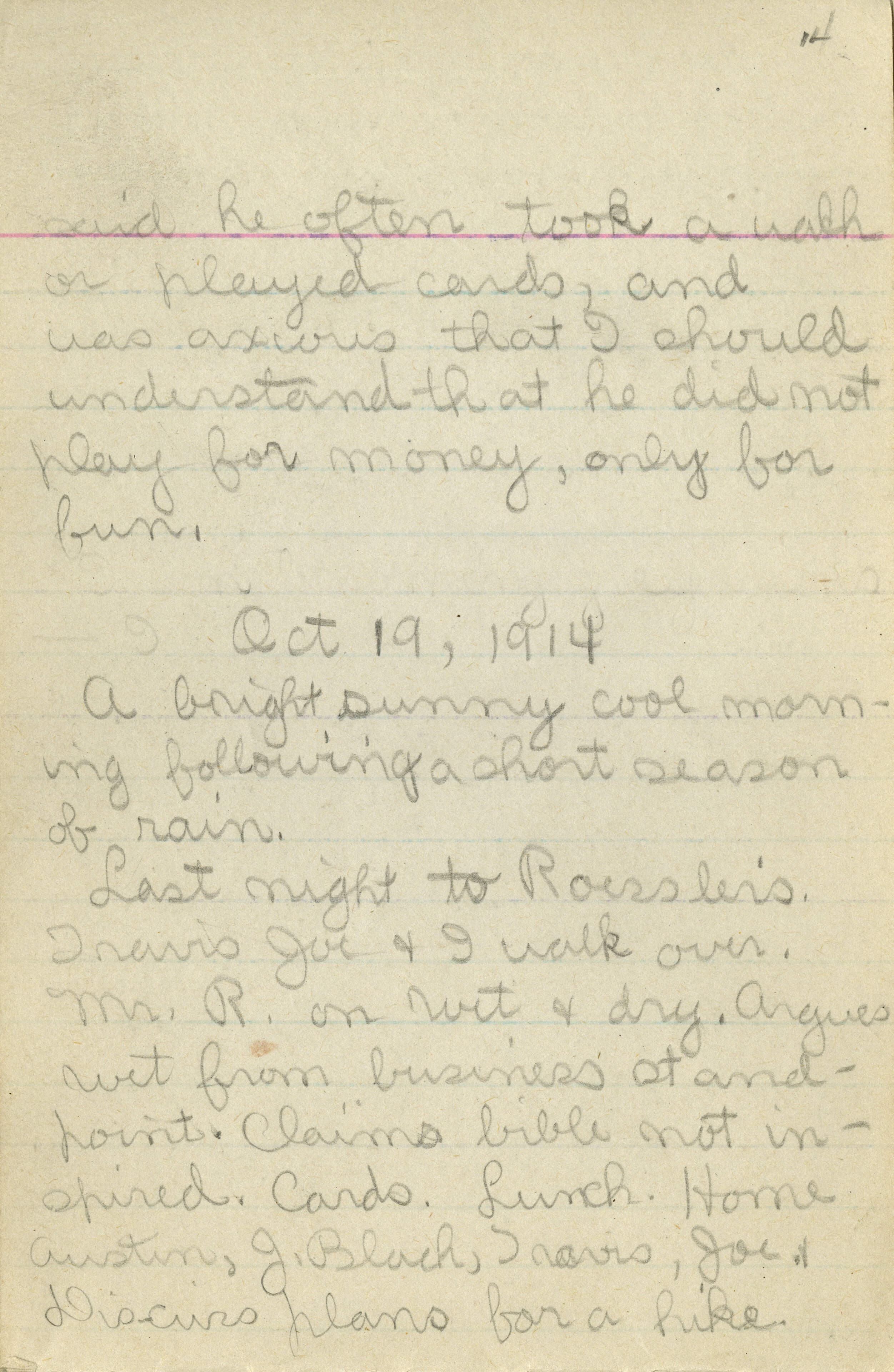[inscription reads] said he often took a walk or played cards, and was anxious that I should understand that he did not play for money, only for fun. / Oct 19, 1914 /A brisk sunny cool morning following a short season of rain. / Last night to Roessler’s. Travis, Joe & I walk over. Mr. R. on wet & dry. Argues wet from business standpoint. Claims bible not inspired. Cards. Lunch. Home. Austin, J. Black, Travis, Joe. Discuss plans for a hike