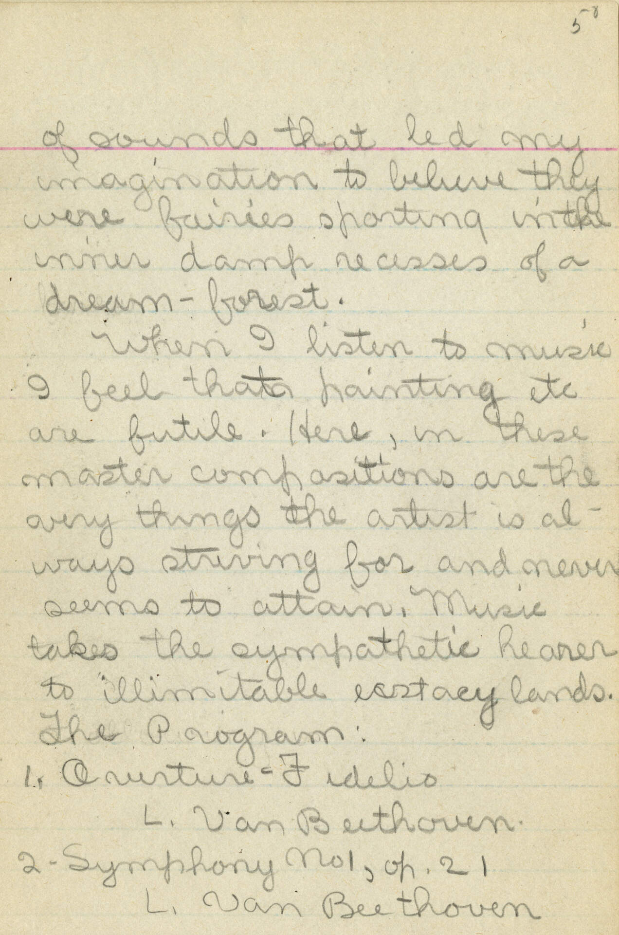 [inscription reads] of sounds that led my imagination to believe they were fairies sporting in the inner damp recesses of a dream-forest. / When I listen to music I feel that painting etc are futile. Here, in these master compositions are the very things the artist is always striving for and never seems to attain. Music takes the sympathetic hearer to illimitable ecstacy lands. / The Program: / 1. Overture - Fidelio / L. Van Beethoven / 2 - Symphony No 1, op. 21 / L. Van Beethoven