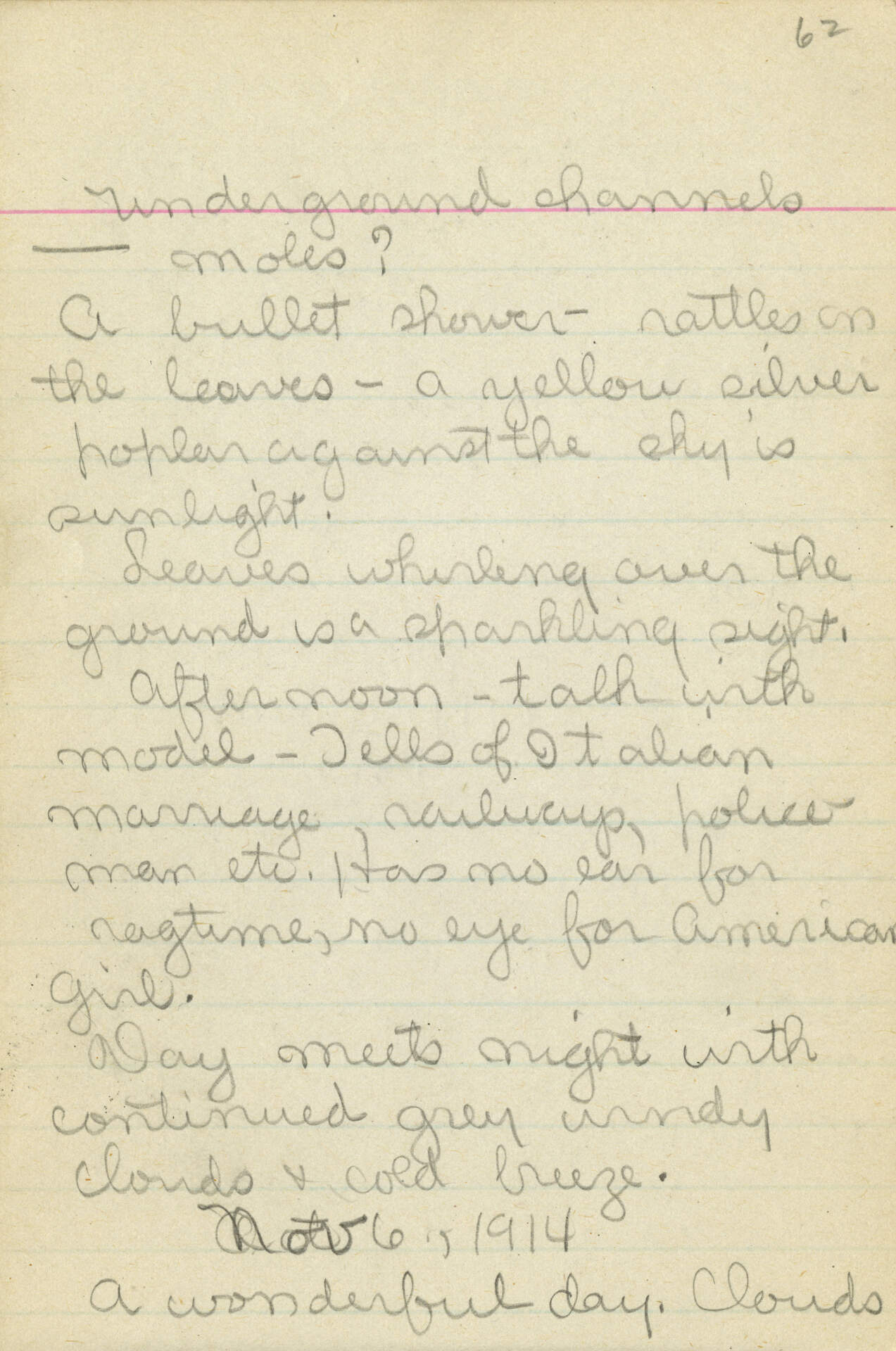 [inscription reads] Underground channels – moles? / A bullet shower - rattles on the leaves - a yellow silver poplar against the sky is sunlight. / Leaves whirling over the ground is a sparkling sight. / Afternoon - talk with model - Tells of Italian marriage, railways, police-man etc. Has no ear for ragtime, no eye for American girl. / Day meets night with continued grey windy clouds & cold breeze. / Nov 6, 1914 / A wonderful day. Clouds