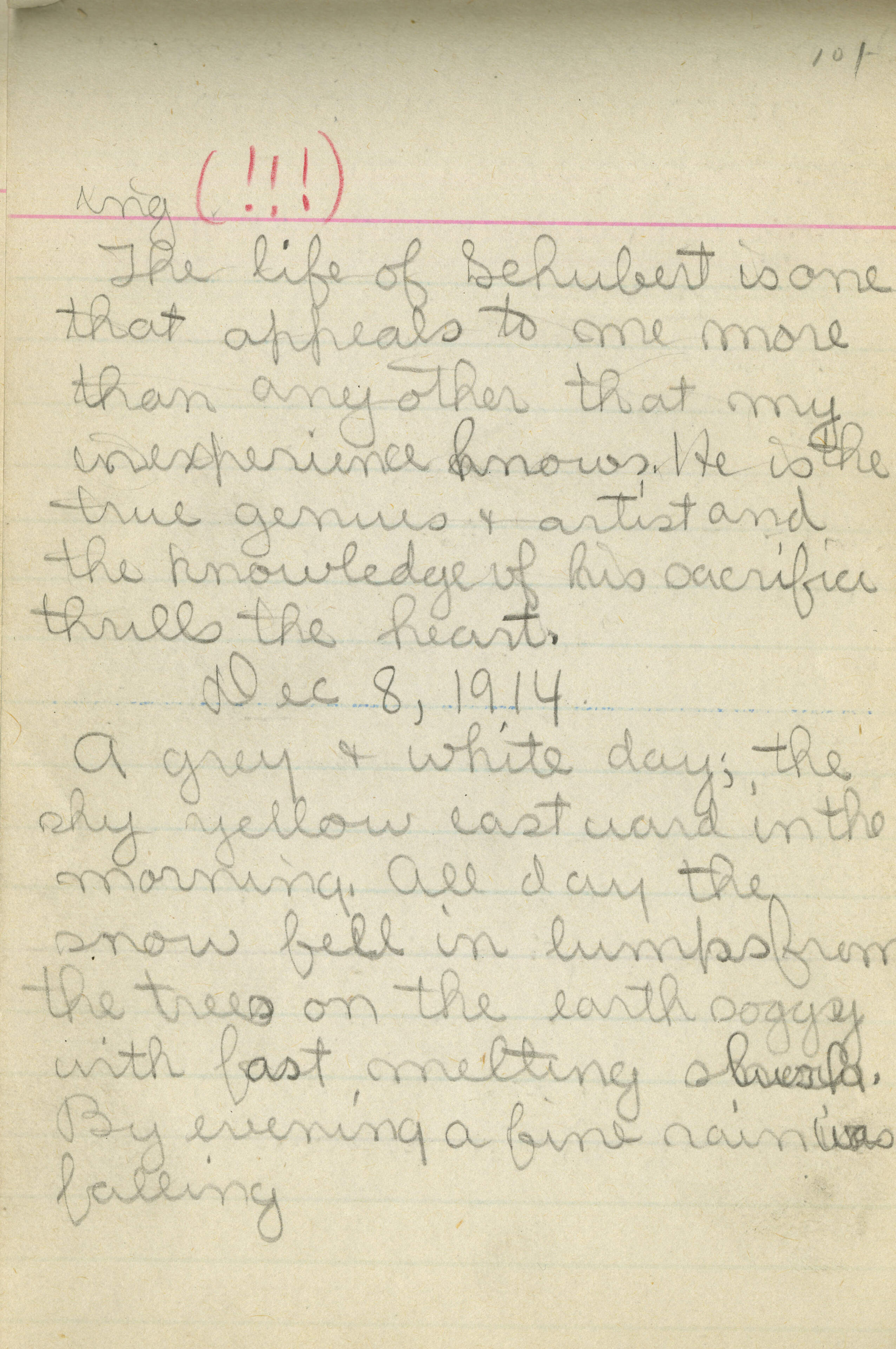 [inscription reads] ing (!!!) / The life of Schubert is one that appeals to me more than any other that my inexperience knows. He is the true genius & art¬ist and the knowledge of his sacrifice thrills the heart. / Dec 8, 1914 / A grey & white day; the sky yellow eastward in the morning. All day the snow fell in lumps from the trees on the earth soggy with fast melting slush. By evening a fine rain was falling