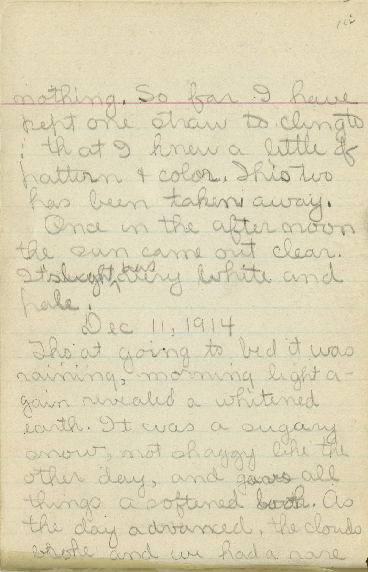 [inscription reads] nothing. So far I have kept one straw to cling to: that I knew a little of pattern & color. This too has been taken away. / Once in the afternoon the sun came out clear. Its light was very white and pale. / Dec 11, 1914 / Tho (sic) at going to bed it was raining, morning light again revealed a whitened earth. It was a sugary snow, not shaggy like the other day, and gave all things a softened look. As the day advanced, the clouds broke and we had a rare