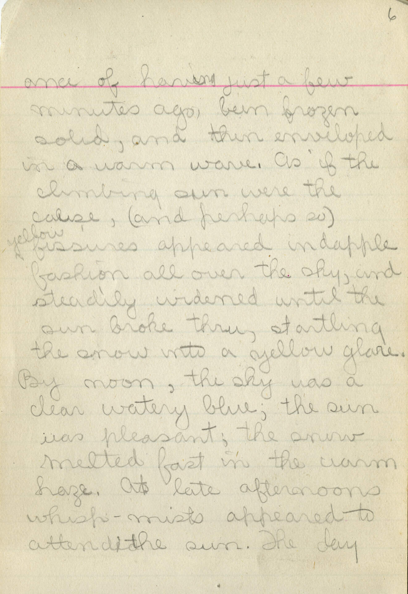 [inscription reads] " ance of having just a few minutes ago, been frozen solid, and then enveloped in a warm wave. As if the climbing sun were the cause, (and perhaps so) yellow fissures appeared in dapple fashion all over the sky, and steadily widened until the sun broke thru (sic), startling the snow into a yellow glare. By noon, the sky was a clear watery blue; the sun was pleasant; the snow melted fast in the warm haze. At late afternoons whisp-mists appeared to attend the sun. The day "