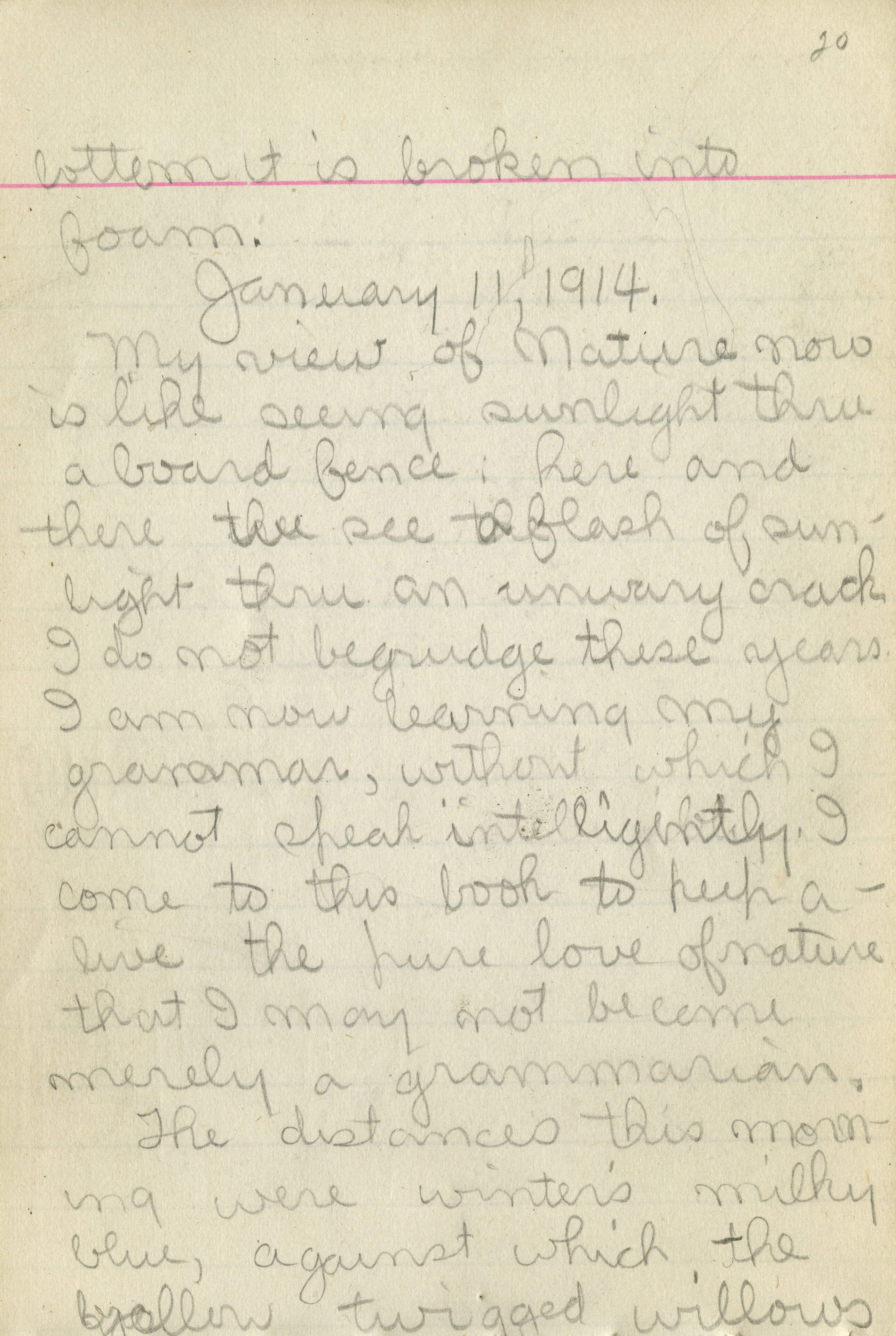 [inscription reads] " bottom it is broken into foam. / January 11, 1914. / My view of Nature now is like seeing sunlight thru (sic) a board fence: here and there we see a flash of sunlight thru (sic) an unwary crack. I do not begrudge these years. I am now learning my grammar, without which I cannot speak intelligently. I come to this book to keep alive the pure love of nature that I may not become merely a grammarian. / The distances this morning were winter’s milky blue, against which the yellow twigged willows "