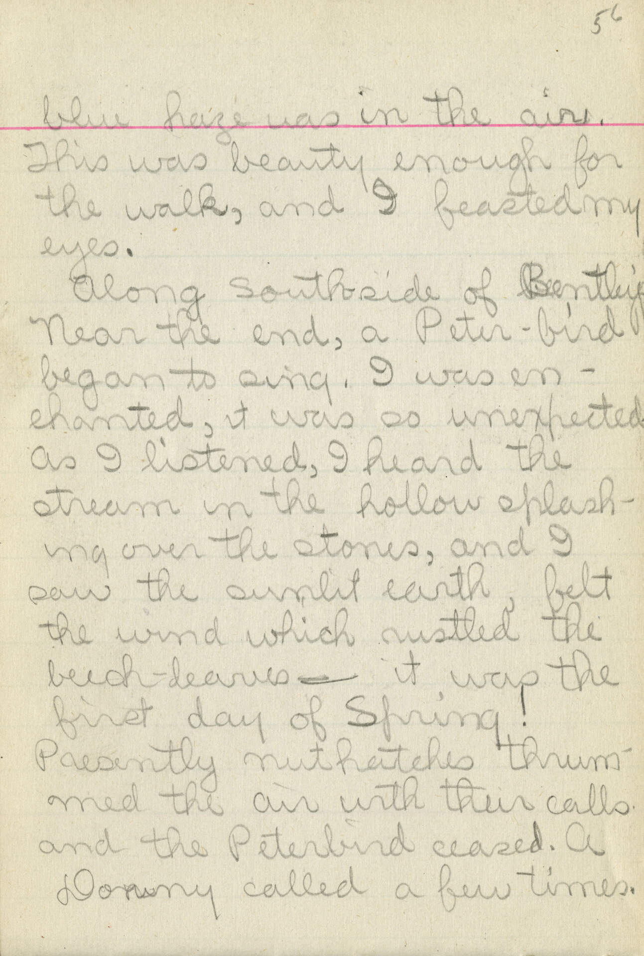 [inscription reads] " blue haze was in the air. This was beauty enough for the walk, and I feasted my eyes. / Along southside of Bentley’s Near the end, a Peter-bird began to sing. I was enchanted, it was so unexpected. As I listened, I heard the stream in the hollow splashing over the stones, and I saw the sunlit earth, felt the wind which rustled the beech-leaves - it was the first day of Spring! / Presently nuthatches thrummed the air with their calls and the Peterbird ceased. A Downy called a few times. "