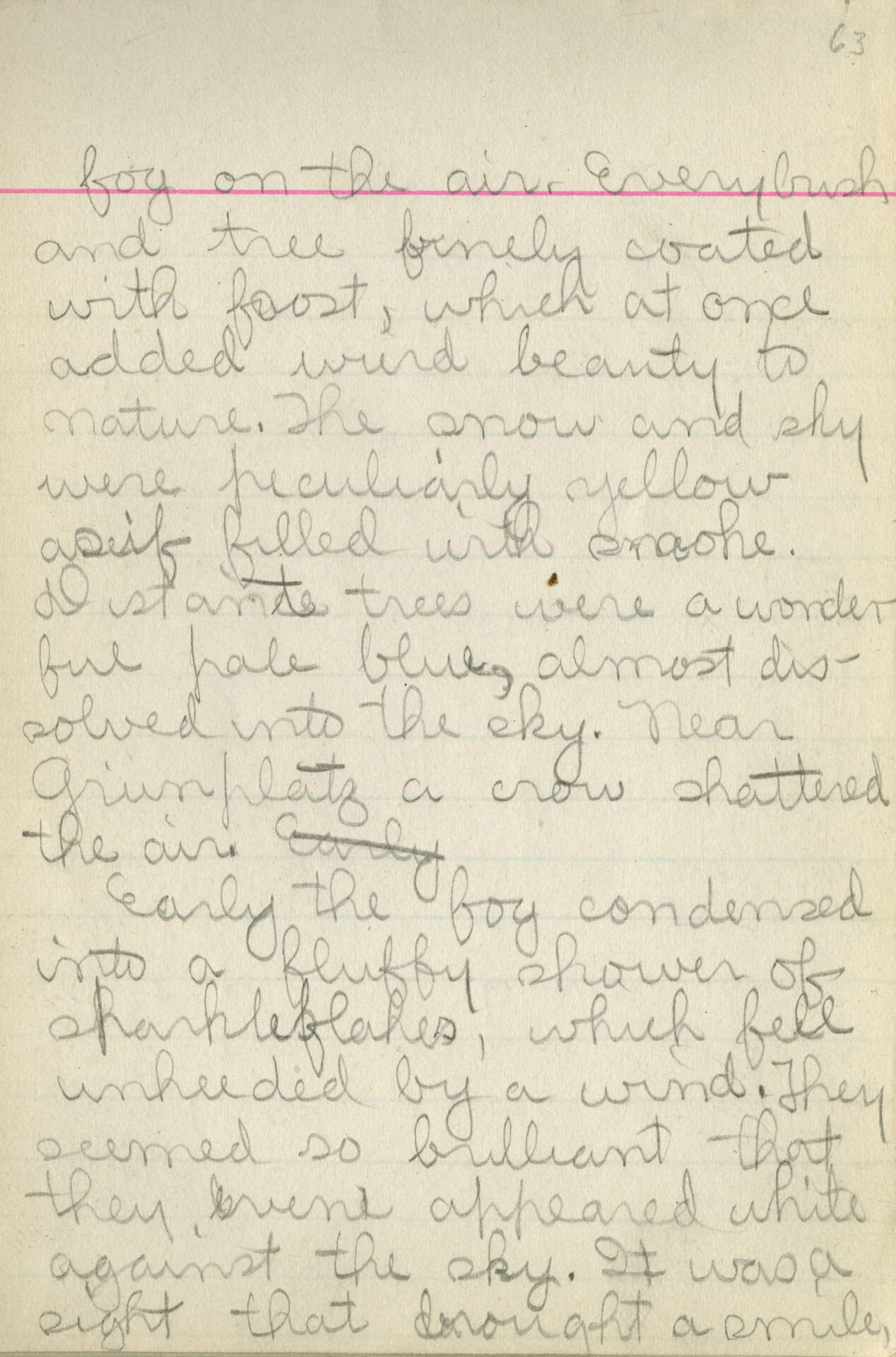 [inscription reads] " fog on the air. Every bush and tree finely coated with frost, which at once added wierd (sic) beauty to nature. The snow and sky were peculiarly yellow as if filled with smoke. Distant trees were a wonderful pale blue, almost dissolved into the sky. Near Grunplatz a crow shattered the air. / Early the fog condensed into a fluffy shower of sparkleflakes, which fell unheeded by a wind. They seemed so brilliant that they even appeared white against the sky. It was a sight that brought a smile, "