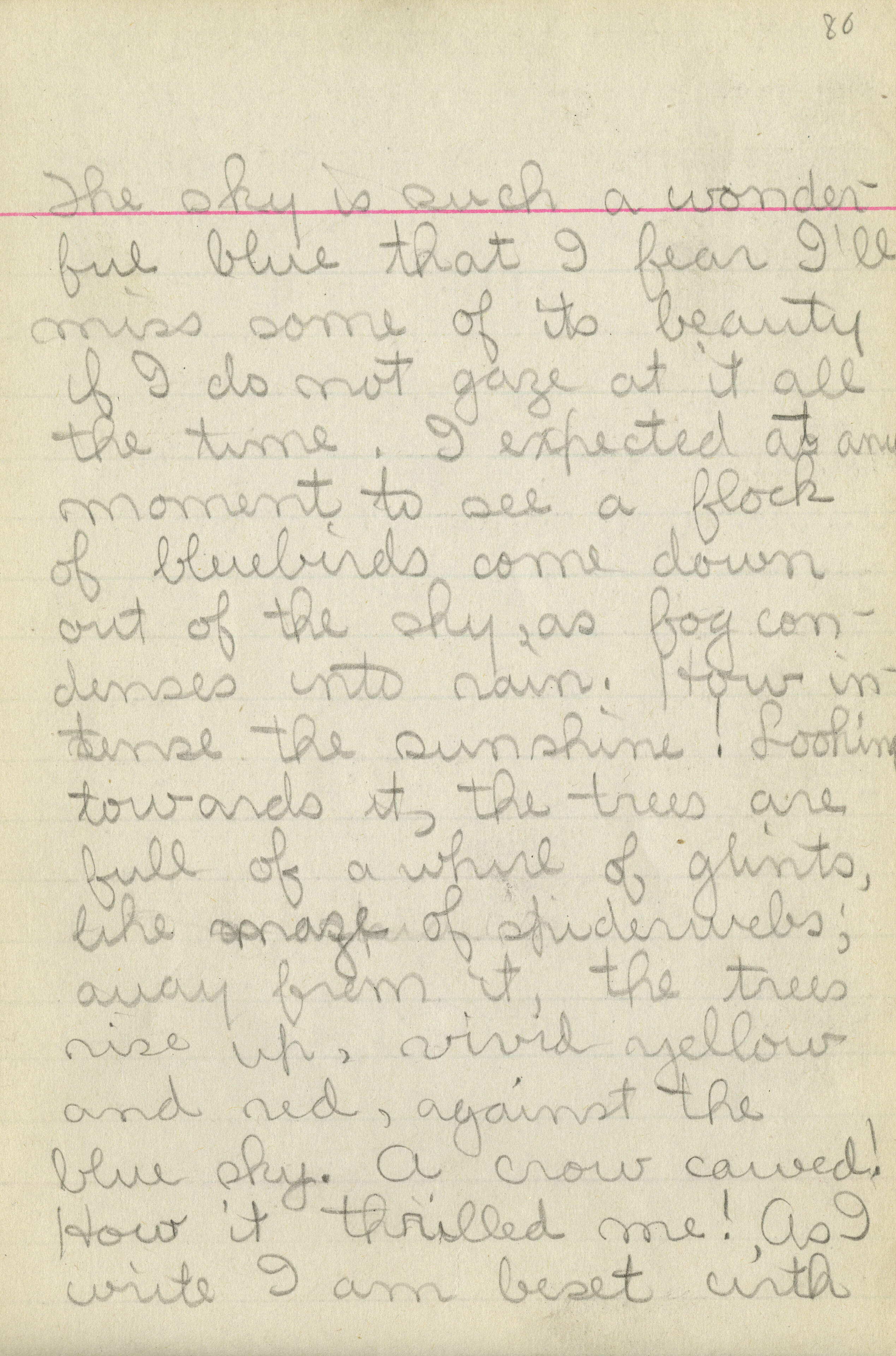 [inscription reads] " The sky is such a wonderful blue that I fear I’ll miss some of its beauty if I do not gaze at it all the time. I expected at any moment to see a flock of bluebirds come down out of the sky, as fog condenses into rain. How intense the sunshine! Looking towards it, the trees are full of a whirl of glints, like maze of spiderwebs; away from it, the trees rise up, vivid yellow and red, against the blue sky. A crow cawed! How it thrilled me! As I write I am beset with "