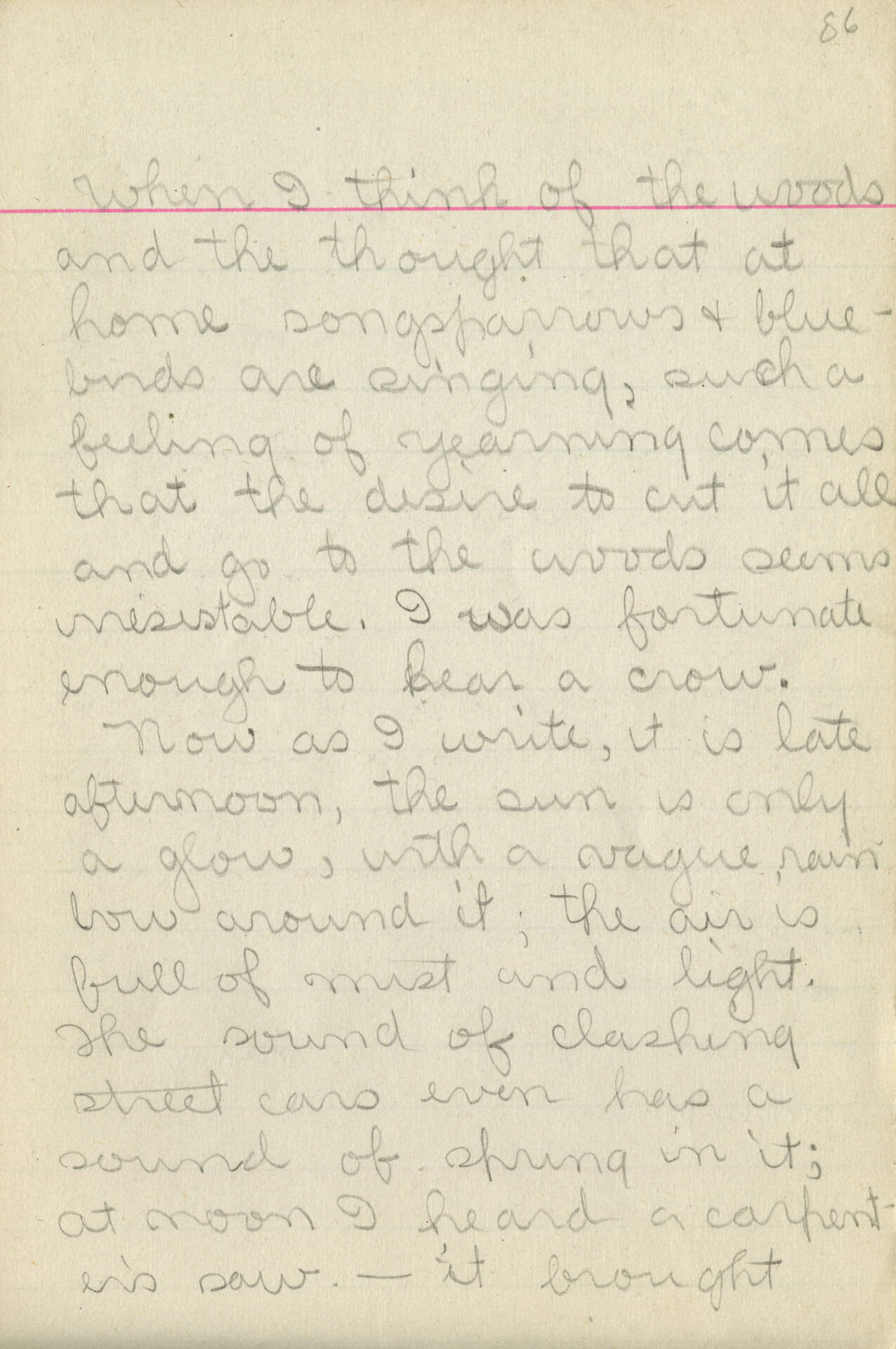 [inscription reads] " When I think of the woods and the thought that at home songsparrows & bluebirds are singing, such a feeling of yearning comes that the desire to cut it all and go to the woods seems irresistable (sic). I was fortunate enough to hear a crow. / Now as I write, it is late afternoon, the sun is only a glow, with a vague rainbow around it; the air is full of mist and light. The sound of clashing street cars even has a sound of spring in it; at noon I heard a carpenter’s saw - it brought "
