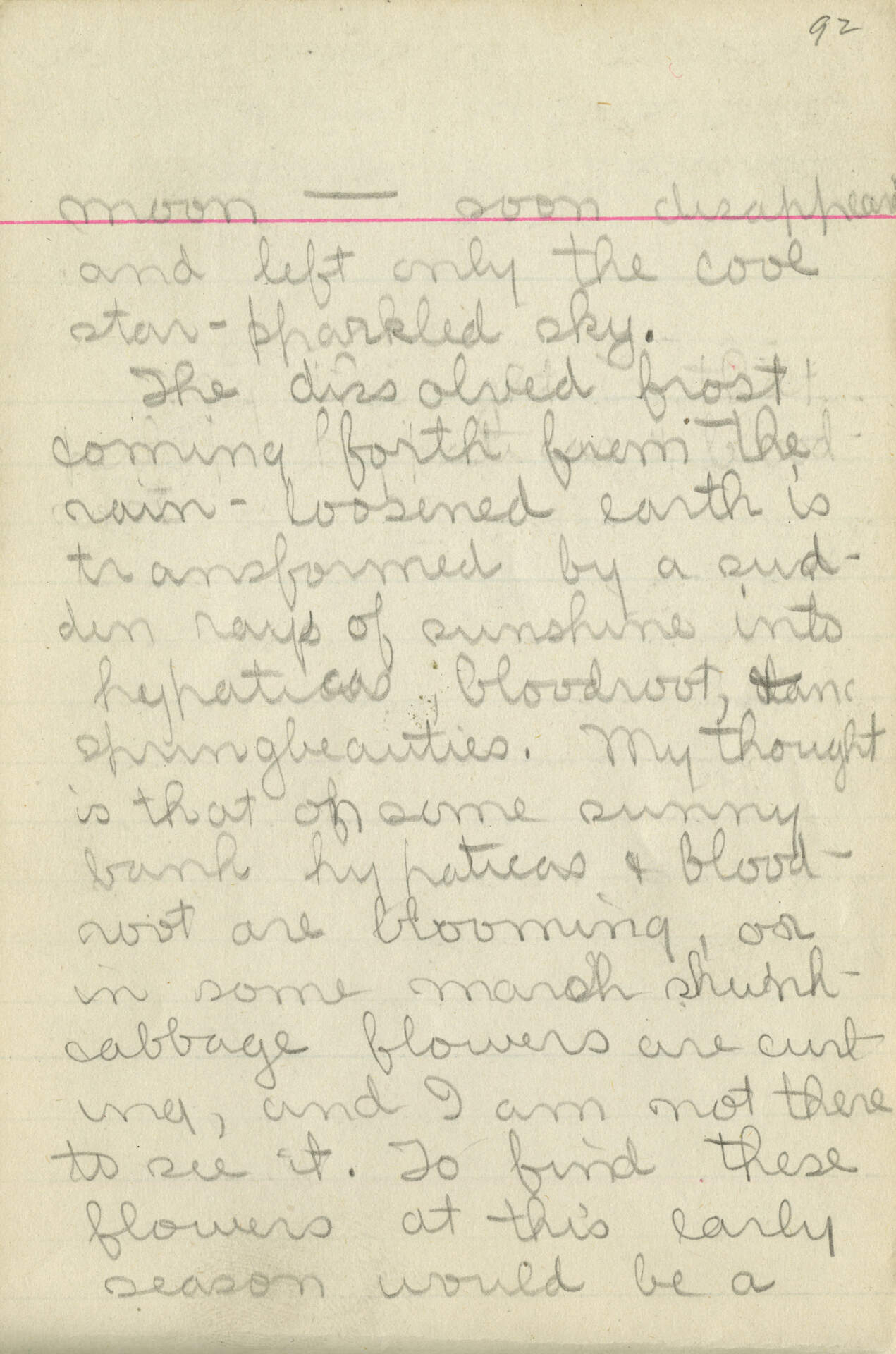 [inscription reads] " moon – soon disappeared and left only the cool star-sparkled sky. / The dissolved frost coming forth from the rain - loosened earth is transformed by a sudden ray of sunshine into hypaticas; blood-root, & springbeauties. My thought is that on some sunny bank hypaticas & bloodroot are blooming, or in some marsh skunkcabbage flowers are curling, and I am not there to see it. To find these flowers at this early season would be a "