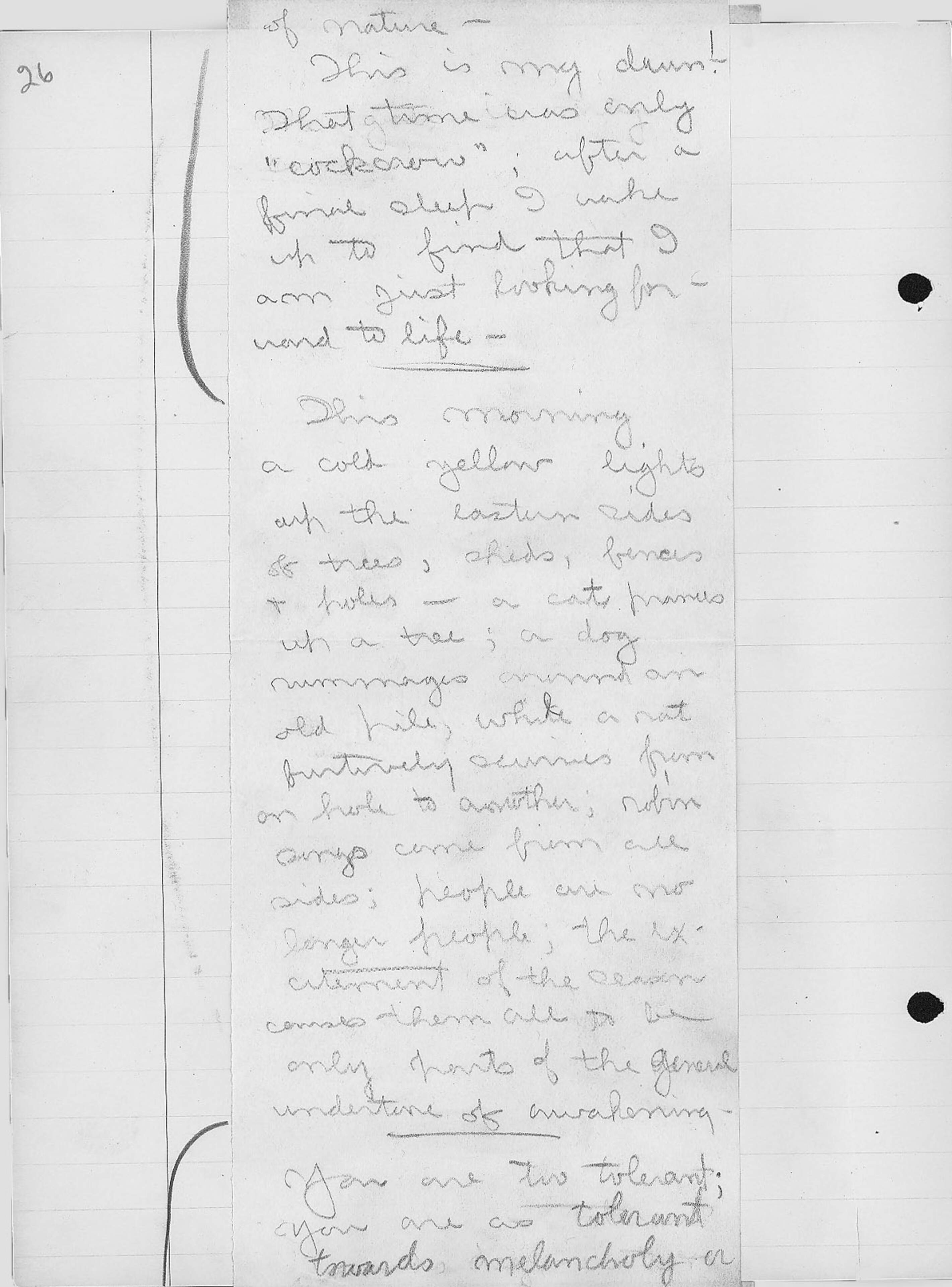 This morning a cold yellow lights up the eastern sides of trees, sheds, fences, & holes – a cat prances up a tree; a dog rummages around an old pile, while a rat furtively scurries from one hole to another; robin songs come from all sides; people are no longer people; the excitement of the season causes them all to be only hearts of the general undertone of awakening -