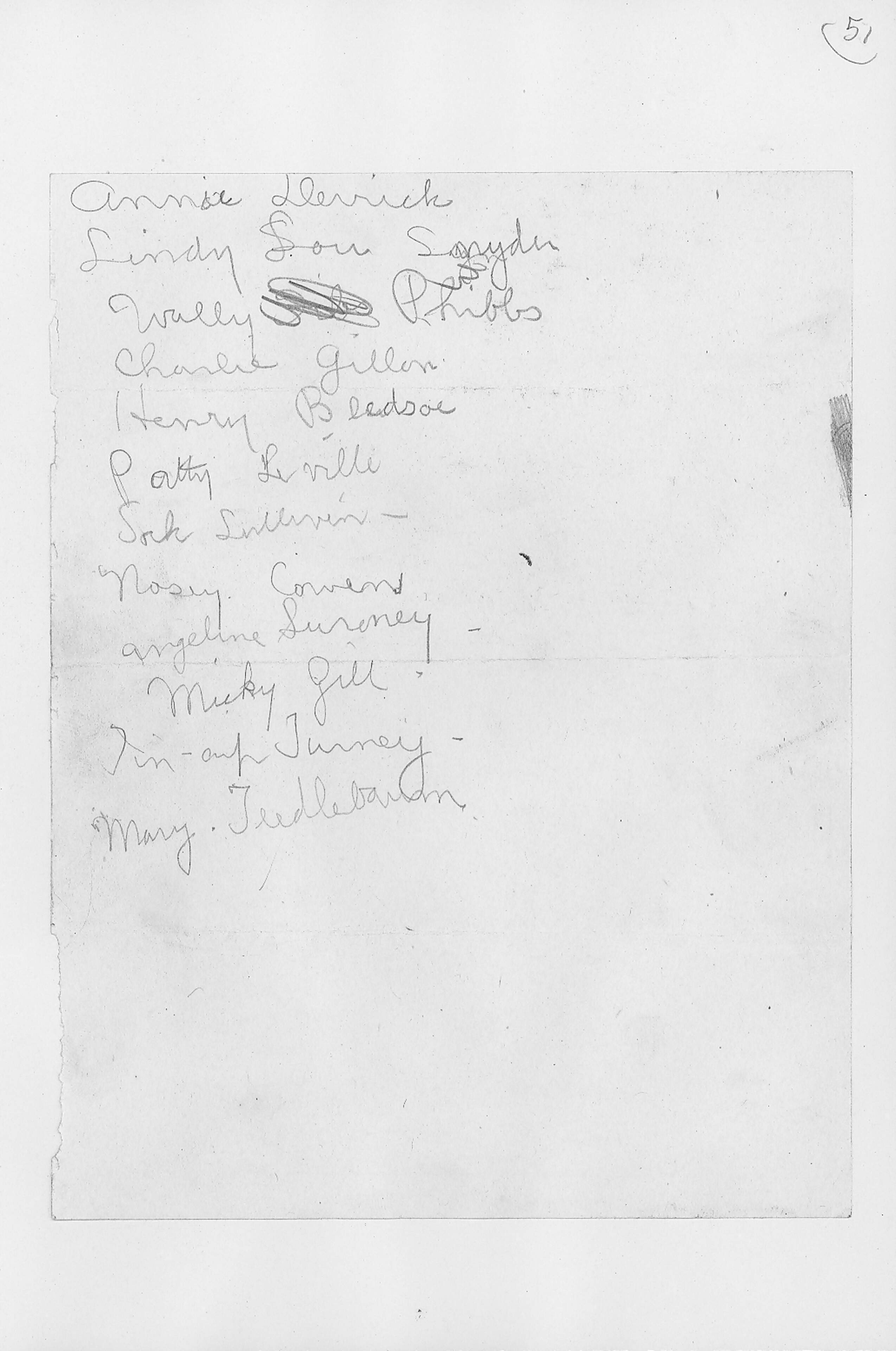 Annie DerrickLindy Lou SnyderWally PhibbsCharlie GillonHenry BledsoePatty LevilleSock Sullivin -Nosey CowenAngeline Suroney -Micky GillTin-cup TurneyMary Teedlebaum