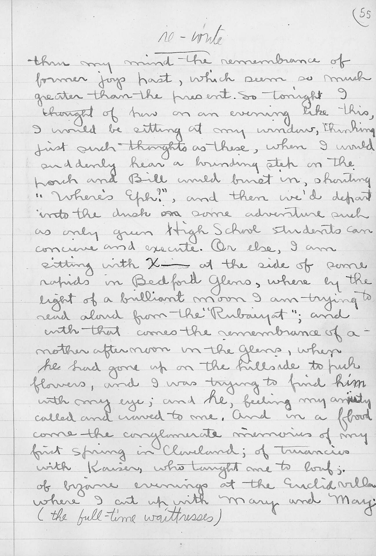 [re-write]thru my mind the remembrance of former joys past, which seem so much greater than the present. So tonight I thought of how on an evening like this, I would be sitting at my window, thinking just such thoughts as these, when I would suddenly hear a bounding step on the porch and Bill would burst in, shouting “Where’s Eph?”, and then we’d depart into the dusk on some adventure such as only green High School students can conceive and execute. Or else, I am sitting with (name is erased and the X and line are written over) X --- at the side of some rapids in Bedford Glens, where by the light of a brilliant moon I am trying to read aloud from the “Rubaiyat”; and with that comes the remembrance of another afternoon in the Glens, when he(looks like she was erased and he is written over) had gone up on the hillside to pick flowers, and I was trying to find him (looks like her was erased and him is written over) with my eye; and he (looks like she was erased and he is written over), feeling my anxiety called and waved to me. And in a flood come the conglomerate memories of my first spring in Cleveland; of truancies with Kaiser, who taught me to loaf, of bizarre evenings at the Euclid villa where I cut up with Mary and May (the full-time waittresses(sic)