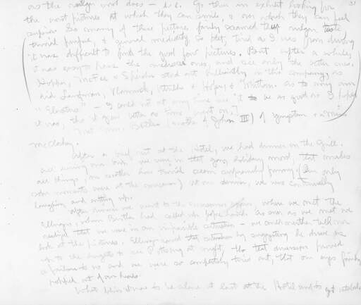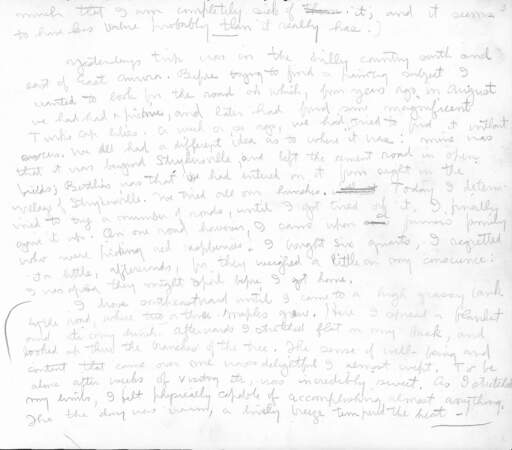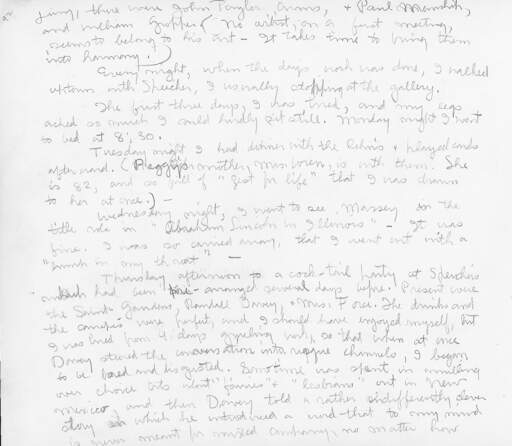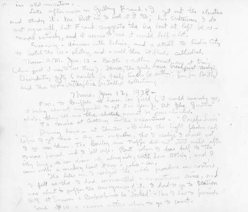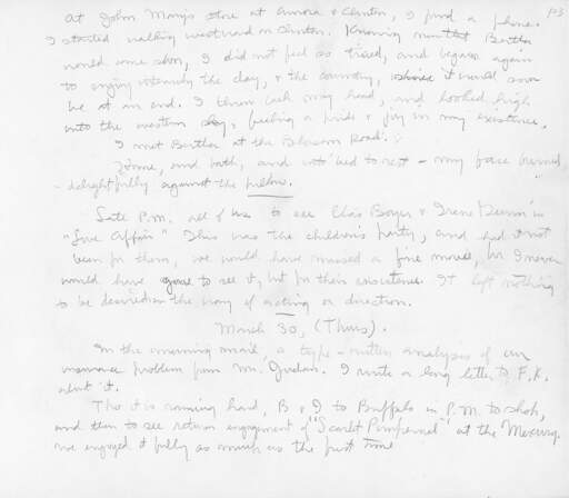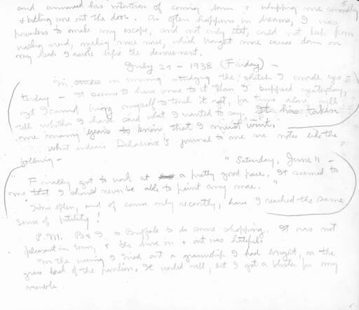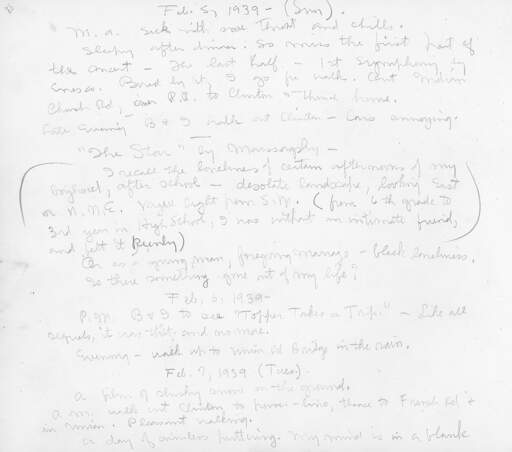 This image is of a page from Burchfield's “July 2, 1938 to – June 23, 1939- / 41”. It was written from July 2, 1938 - June 23, 1939 on a handmade volume with cardboard covers, unlined paper, fastened with 2 brass fasteners and tape. It consists of 138 pages one of which contains a newspaper clipping “It Seems to Me” by Heywood Broun. Some entries are highlighted with red pencil marks in the margins. Back cover detached. It was gifted to the Burchfield Penney Art Center by the Charles E. Burchfield Foundation in 2000.