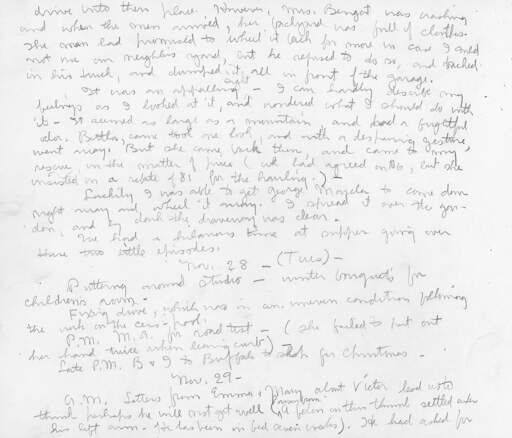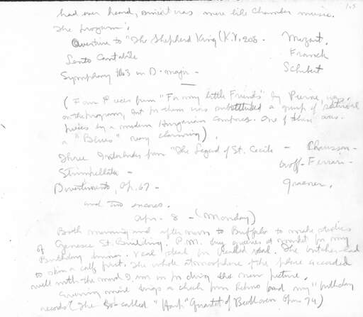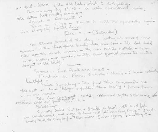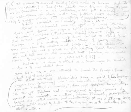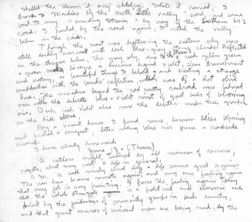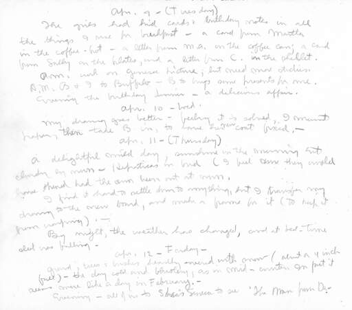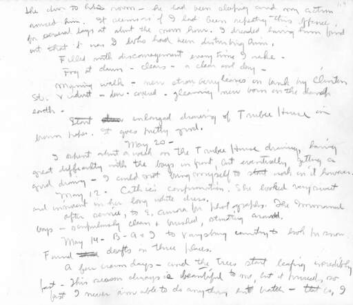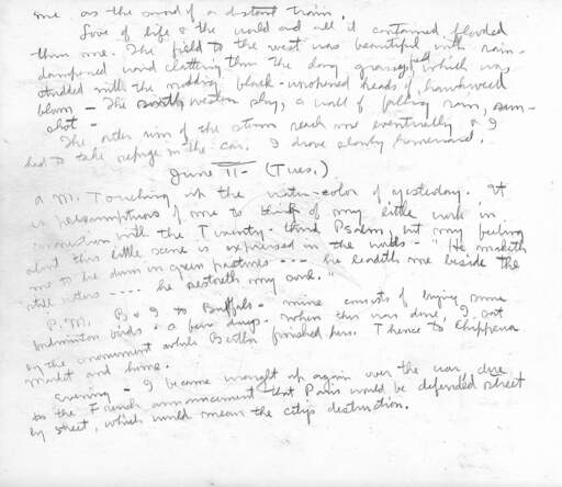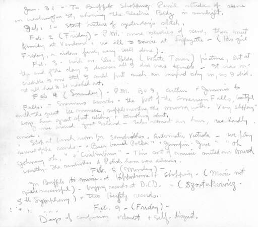 This image depicts a journal page from "June 26, 1939 to June 13 – 1940 - / 42", a handmade volume composed of cardboad covers; unlined paper; and fastend with two brass fasteners with 133 pages inside. There are doodles on the front and back covers. Some entries are highlighted with red pencil marks in the margins. It was gifted by the Charles E. Burchfield Foundation in 2000.