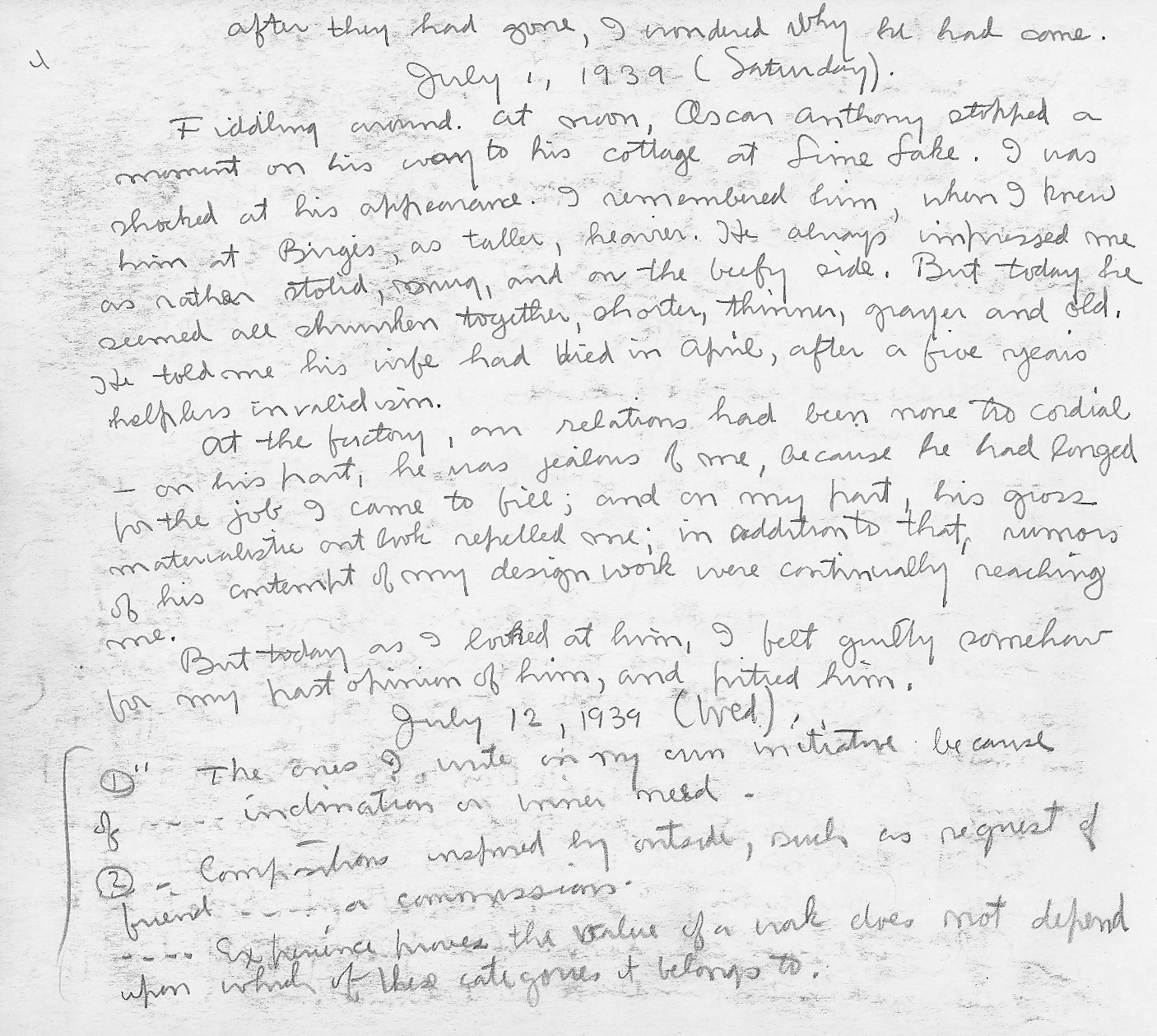 After they had gone, I wondered why he had come.July 1, 1939 (Saturday)Fiddling around at noon, Oscar Anthony stopped a moment on his way to his cottage at Lime Lake. I was shocked at his appearance. I remembered him, when I knew him at Birge’s, as taller, heavier. He always impressed me as Nathan stolid, snug, and on the beefy side. But today he seemed all shrunken together, shorter, thinner, grayer and old. He told me his wife had died in April, after a five year’s helpless invalidism.At the factory, out relations had been none too cordial – on his part, he was jealous of me, because he had longed for the job I came to fill; and on my part, his gross materialistic outlook repelled me; in addition to that, rumors of his contempt of my design work were continually reaching me. But today as I looked at him, I felt guilty somehow for my past opinion of him, and pitied him.July 12, 1939 (Wed).(1); “The ones I write on my own initiative because of – – – – inclination or inner need. (2); – Compositions inspired by outside, such as request of friend – – – – or commissions.– – – – Experience proves the value of a work does depend upon which of these categories it belongs to.