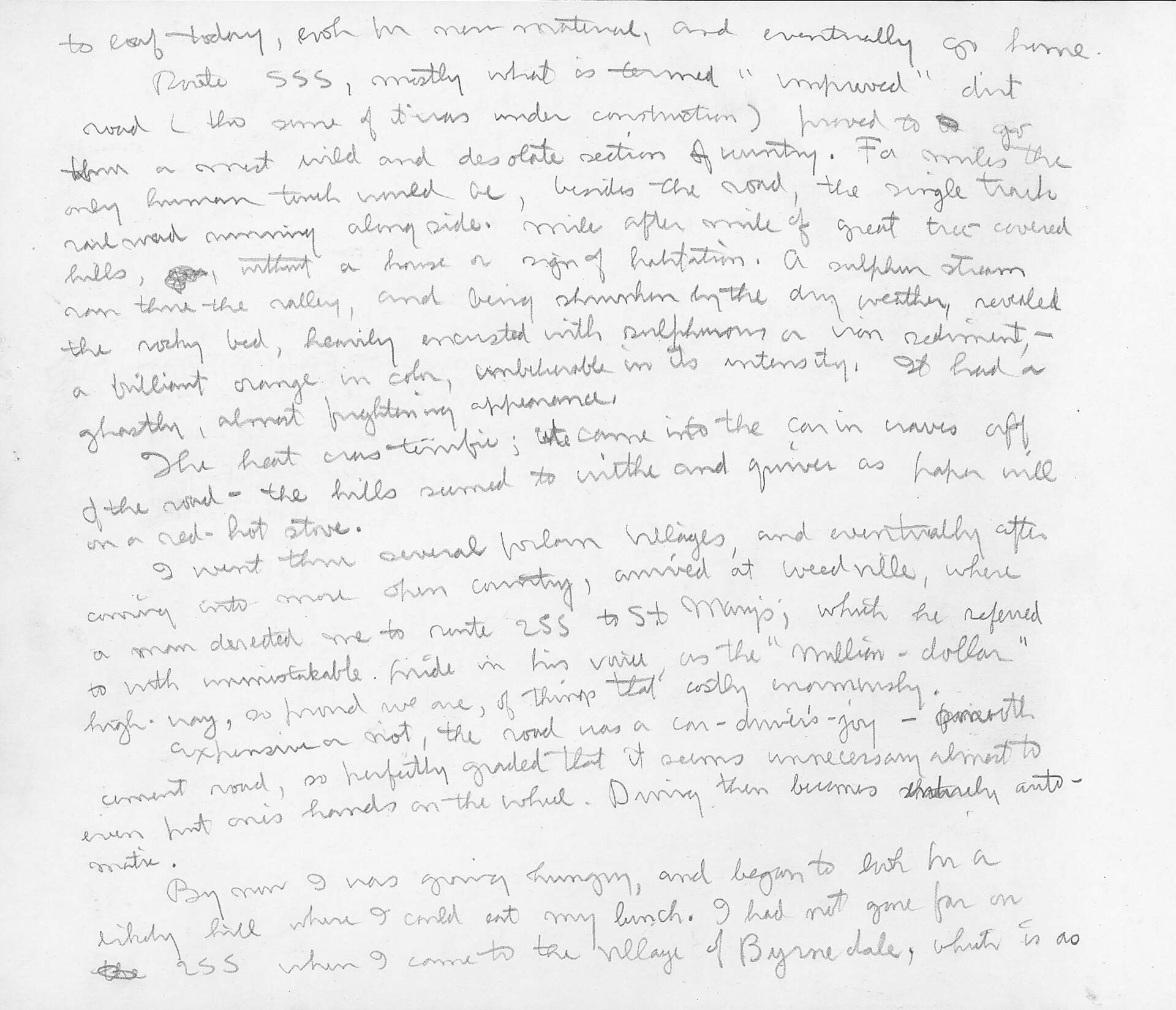 to loaf today, look for new material, and eventually go home. ; Route 555, mostly what is termed “improved” dirt road (to some of it was under construction) proved to go thru a most wild and desolate section of country. For miles the only human touch would be, besides the road, the single track railroad running alongside. Mile after mile of great tree-covered hills, without a house or sign of habitation. A sulphur stream ran thru the valley, and being shrunken by the dry weather, revealed the rocky bed, heavily encrusted with sulphurous or iron sediment, - a brilliant orange in color, unbearable in its intensity. It had a ghostly, almost frightening appearance. ; The heat was terrific; it came into the car in waves off of the road – the hills seemed to withe and quiver as paper will on a red-hot stove. ; I went thru several forlorn villages, and eventually after coming into more open country, arrived at Weedville, where a man directed me to route 255 to St. Mary’s; which he referred to with unmistakable pride in his voice, as the “million-dollar” high-way, so proud we are, of things that costly [sic] enormously.; Expensive or not, the road was a car-driver’s-joy- smooth cement road, so perfectly graded that it seems unnecessary almost to even put one’s hands on the wheel. Driving then becomes entirely automatic. ; By now I was growing hungry, and began to look for a hiking hill where I could eat my lunch. I had not gone far on 255 when I came to the village of Byrnedale, which is as