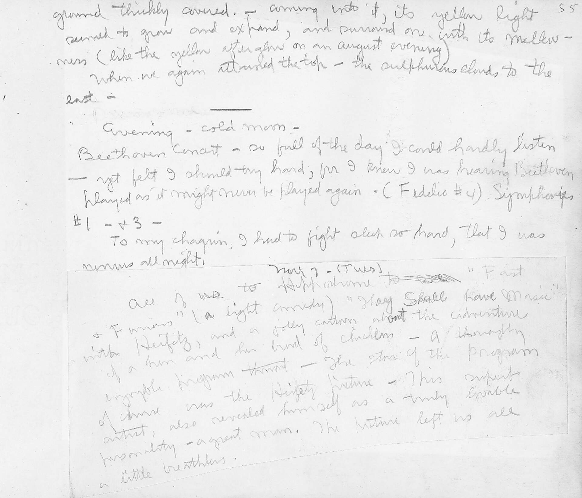 ground thickly covered. – coming into it, its yellow light seemed to grow and expand, and surround one with its mellow-ness (like the yellow afterglow on an August evening); When we again attained the top – the sulphurous clouds to the east – ; ; ; ; _______________; Evening – cold moon –Beethoven Concert – so full of the day I could hardly listen – yet felt I should try hard, for I knew I was hearing Beethoven played as it might never be played again. (Fidelio # 4) Symphonies # 1 - & 3 –; To my chagrin, I had to fight sleep so hard, that I was nervous all night. ; ; ; ; ; ; Nov 7 – (Tues); ; All of us to Hippodrome to see “Fast & Furious” (a light comedy) “They Shall have Music” with Heifetz, and a jolly cartoon about the adventure of a hen and her brood of chickens – A thoroughly enjoyable program thruout – the star of the program of course was the Heifetz picture – This superb artist, also revealed himself as a truly loveable personality – a great man. The picture left us all a little breathless.
