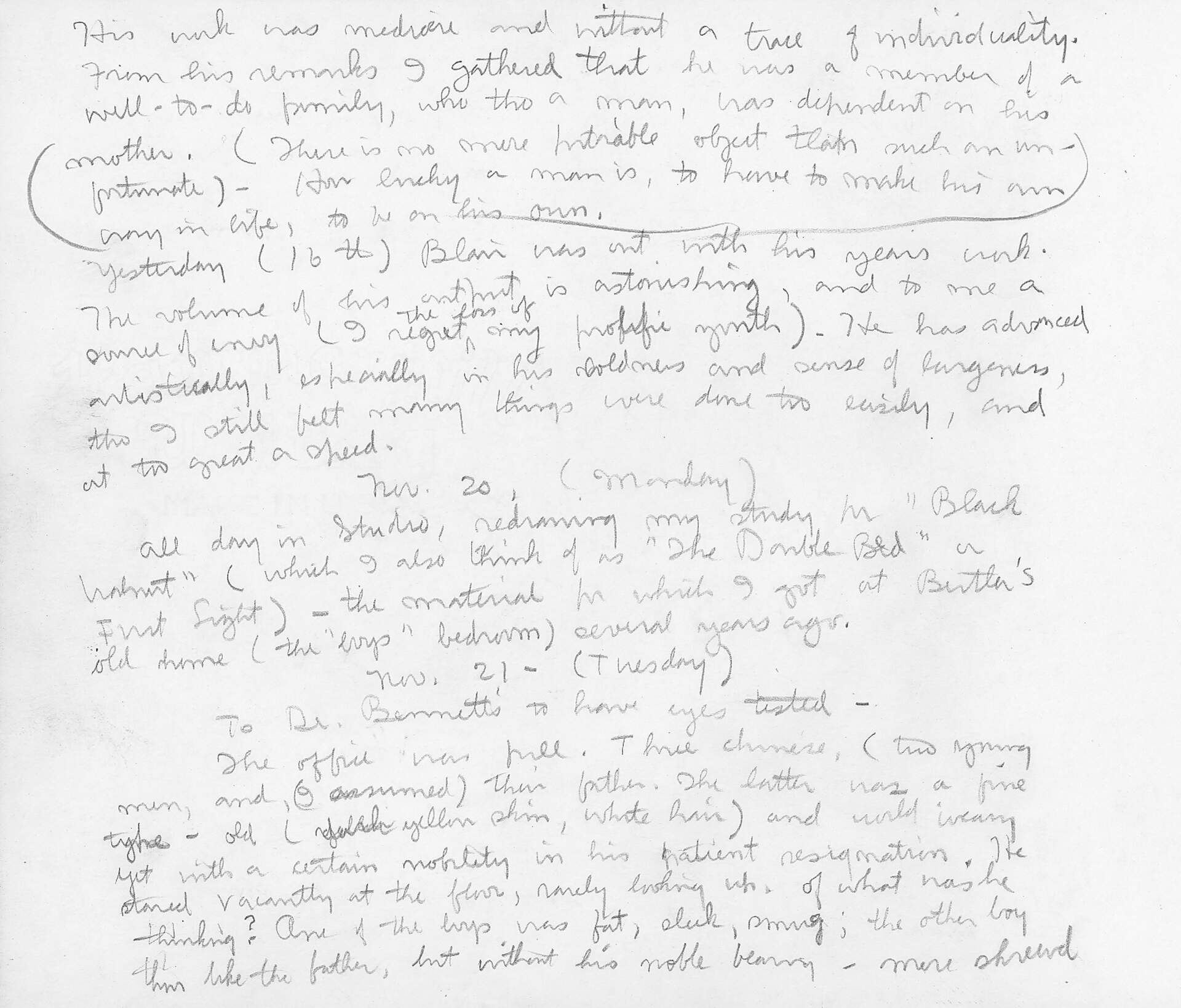 His work was mediocre and without a trace of individuality. From his remarks I gathered that he was a member of a well-to-do family, who tho a man, was dependent on his mother. (There is no mere pitiable object than such an unfortunate) – How lucky a man is, to have to make his own way in life, to be on his own. Yesterday (16th) Blair was out with his years work. The volume of his output is astonishing, and to one a source of envy (I regret the loss of my prolific youth). He has advanced artistically, especially in his boldness and sense of largeness, tho I still felt many things were done too easily, and at too great a speed.; ; ; ; ; Nov. 20, (Monday); All day in Studio, redrawing my study for “Black Walnut” (which I also think of as “The Double Bed” on First Sight) – the material for which I got at Bertha’s old home (the “boys” bedroom) several years ago. ; ; ; ; ; Nov. 21 – (Tuesday); To Dr. Bennett’s to have eyes tested –; The office was full. Three Chinese, (too young men, and, (I assumed) their father. The latter was a fine type – old (dark yellow skin, white hair) and world weary yet with a certain nobility in his patient resignation. He stared vacantly at the floor, rarely looking up. Of what was he thinking? One of the boys was fat, sleek, smug; the other boy thus like the father, but without his noble bearing – more shrewd