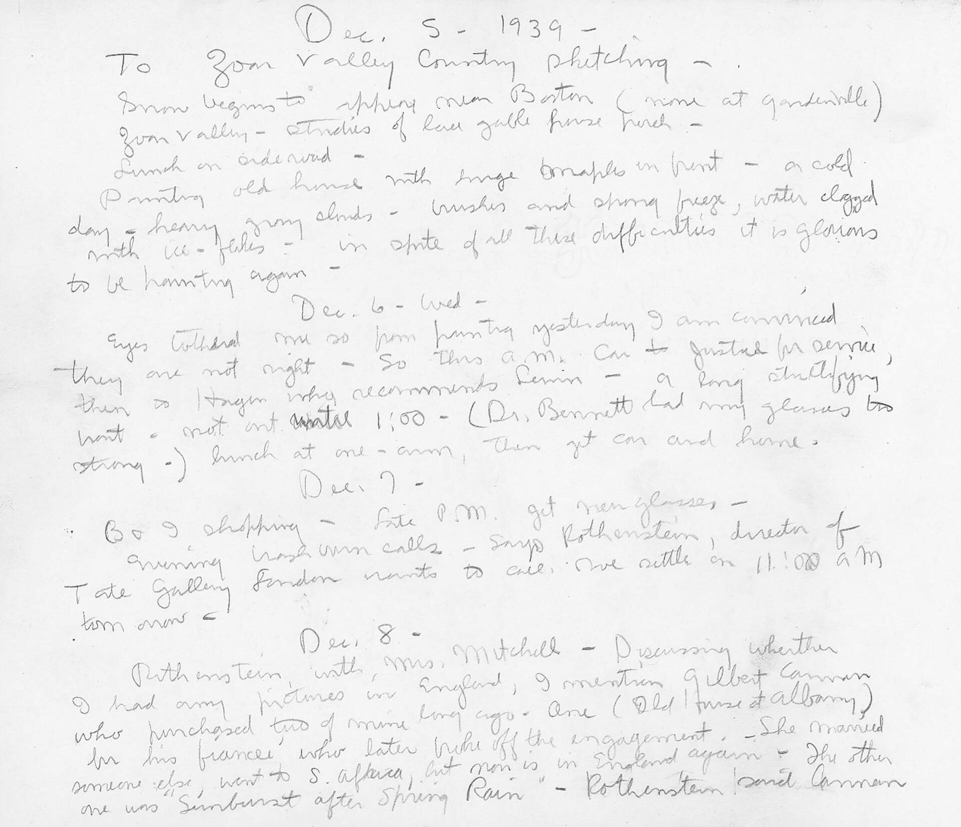 Dec. 5 – 1939 –; To Zoar Valley country sketching –; Snow begins to appear near Boston (none at Gardenville); Zoar Valley – studies of lace gable house porch –; Lunch on sideroad –; Painting old house with huge maples in front – a cold day – heavy gray clouds – brushes and sponge freeze, water clogged with ice-flakes – in spite of all these difficulties it is glorious to be painting again –; ; ; ; ; Dec. 6 – Wed –; Eyes bothered me so from painting yesterday I am convinced they are not right – So this A.M. Car to Justice for service, then to Hagen who recommends Lewin – a long stupefying wait – not out until 1:00 – (Dr. Bennett had my glasses too strong –) lunch at one-arm, then get car and home.; ; ; ; ; Dec. 7 –; B & I shopping – Late P.M. get new glasses –; Evening Washburn calls – says Rothenstein, director of Tate Gallery London wants to call. We settle on 11:00 AM tomorrow.Dec. 8 –; Rothenstein, with Mrs. Mitchell – discussing whether I had any pictures in England, I mention Gilbert Cannan who purchased two of mine long ago. One (Old House at Albany) for his fiancé who later broke off the engagement. She married someone else, went to S. Africa, but now is in England again – The other one was “Sunburst after Spring Rain” – Rothenstein said Cannan