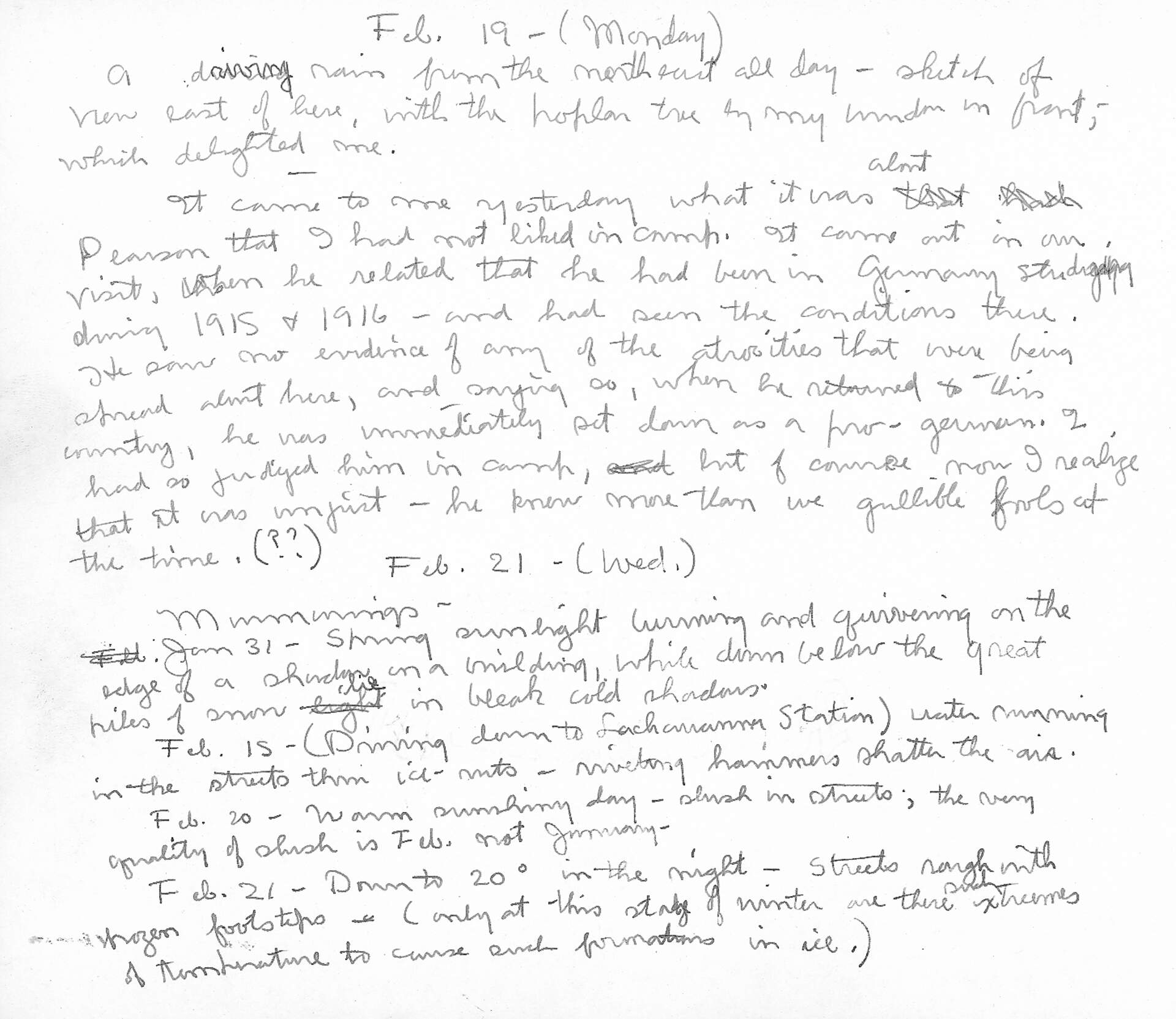 Feb. 19 – (Monday); A driving rain from the northeast all day – sketch of view east of here, with the poplar tree by my window in front; which delighted me.______; It came to me yesterday what it was about Pearson that I had not liked in camp. It came out in our visit, when he related that he had been in Germany studying during 1915 & 1916 – and had seen the conditions there. He saw no evidence of any of the atrocities that were being spread about here, and saying so, when he returned to this country, he was immediately set down as pro-german [sic]. I had so judged him in camp, but of course now I realize that it was unjust – he knew more than we gullible fools at the time. (??); ; ; ; ; Feb. 21 – (Wed.); Murmurings –; Feb. Jan 31 – Spring sunlight burning and quivering on the edge of a shadow in a building, while down below the great piles of snow lie in bleak cold shadows.; Feb. 15 – (Driving down to Lackawanna Station) water running in the streets thru ice-ruts – riveting hammers shatter the air.; Feb. 20 – Warm sunshiny day – slush in sheets; the very quality of slush is Feb. not January –; Feb. 21 – Down to 20° in the night – streets rough with frozen footsteps – (only at this stage of winter are there such extremes of temperature to cause such formations in ice.)
