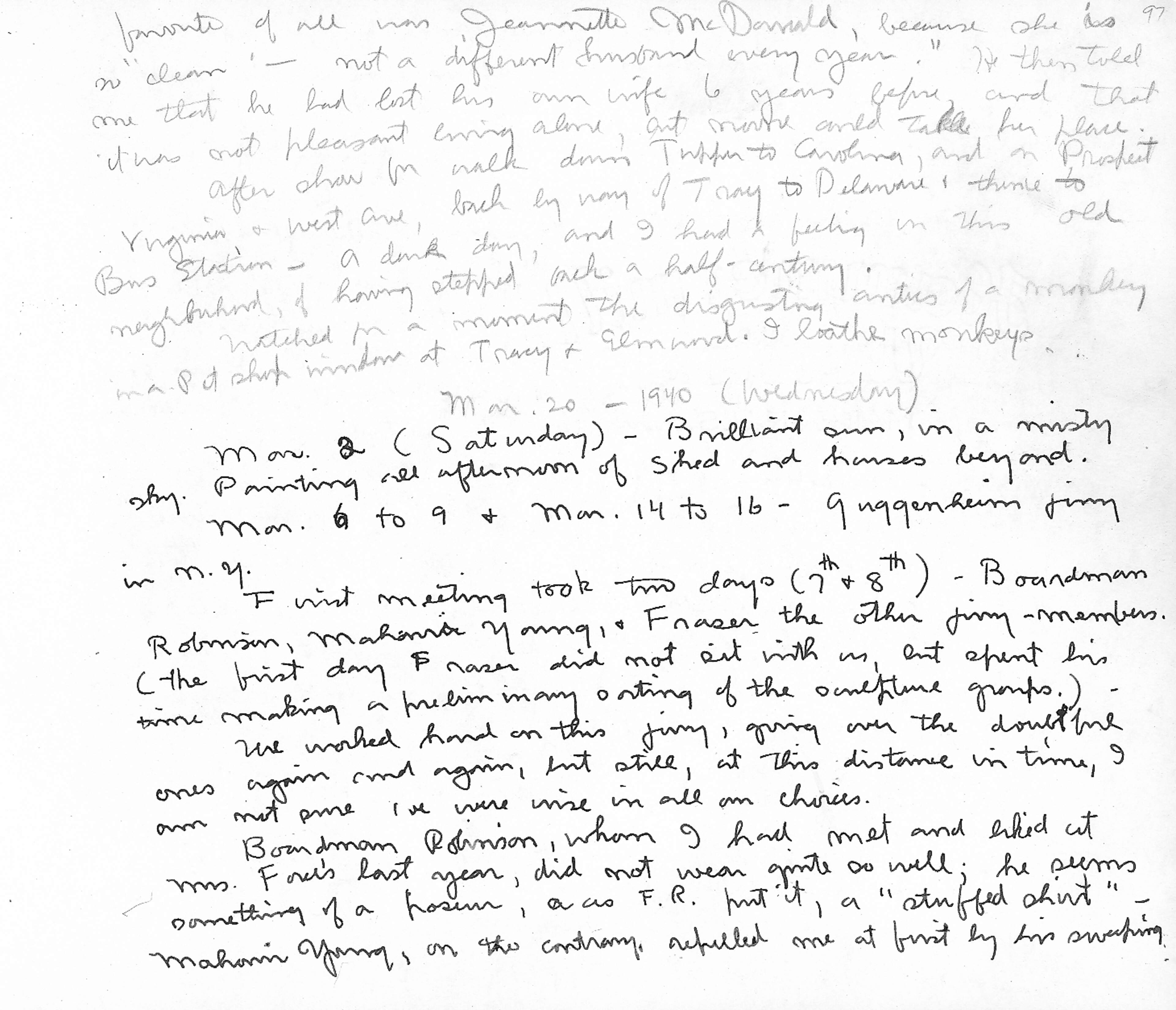favorite of all was Jeannette McDonald, because she is so “clean’ – not a different husband every year.” He then old me that he had lost his own wife 6 years before, and that it was not pleasant living alone, but no one could take her place.; After show for walk down Tupper to Carolina, and on Prospect Virginia & West Ave, back by way of Troy to Delaware, thence to Bus Station – A dark day, and I had a feeling in this old neighborhood, of having stepped back a half-century. ; Watched for a moment the disgusting antics of a Monkey in a Pet shop window at Tracy & Elmwood. I loathe monkeys.; ; ; ; ; Mar. 20 – 1940 (Wednesday); Mar. 2 (Saturday) – Brilliant sun, in a misty sky. Painting all afternoon of shed and houses beyond.; Mar. 6 to 9 & Mar. 14 to 16 – Guggenheim jury in N.Y.; First meeting took two days (7th & 8th) – Boardman, Robinson, Mahonic Young, & Fraser the other jury-members. (the first day Fraser did not sit with us, but spent his time making a preliminary sorting of the sculpture groups.) –; We worked hard on this jury, going over the doubtful ones again and again, but still, at this distance in time, I am not sure we were wise in all our choices.; Boardman Robinson, whom I had met and liked at Mrs. Force’s last year, did not wear quite so well; he seems something of a poseur, as F.R. put it, a “stuffed shirt” – Mahonic Young, on the contrary, repelled me at first by his sweeping