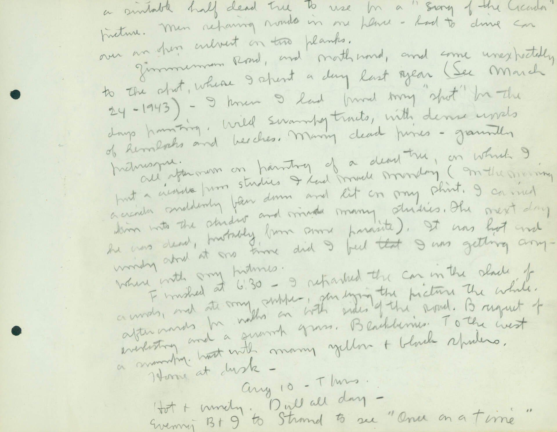 Zimmerman Road, and northward, and came unexpectedly to the spot, where I spent a day last year (See March 24, 1943)—I know I had found me “spot” for the day’s painting. Wild swampy tracts, with dense woods of hemlocks and beeches. Many dead pines—gauntly picturesque.
