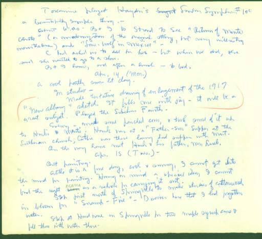 Charles E. Burchfield (1893-1967), Untitled (Journal Page), Pg 14, April 15, 1947 - April 18, 1947; blue ink on unlined paper, 9 1/2 x 11 3/4 inches; Burchfield Penney Art Center courtesy of the Charles E. Burchfield Foundation, 2000