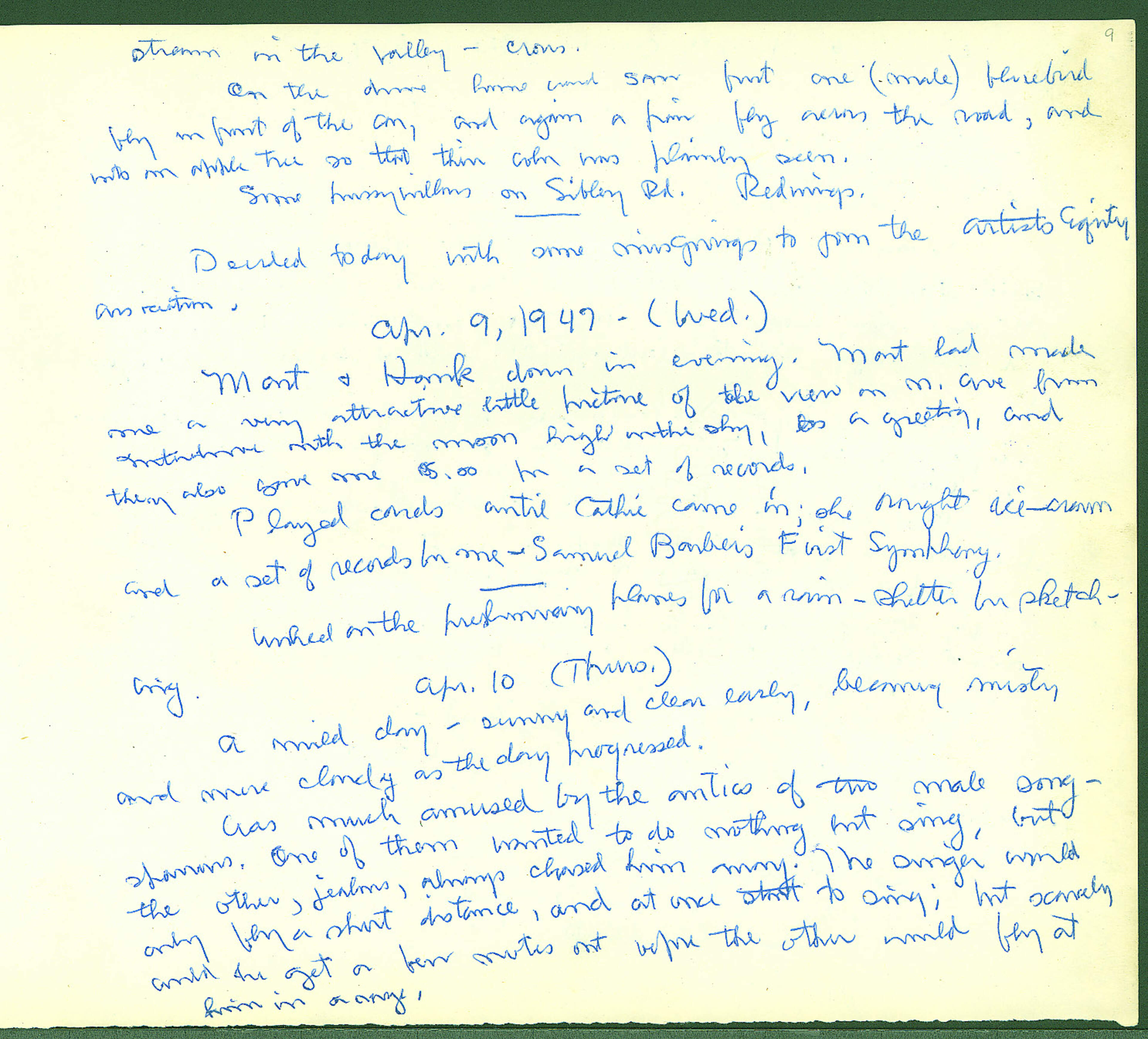 Decided today with some misgivings to join the Artists Equity Association. Apr. 9, 1947—(Wed.) Mart & Hank down in evening. Mart had made me a very attractive little picture of the view on N. Ave from [CD] with the moon high in the sky, as a greeting, and they also gave me $5.00 for a set of records. Played cards until Cathie came in; she bought ice-cream and a set of records for me—Samuel Barber’s First Symphony.