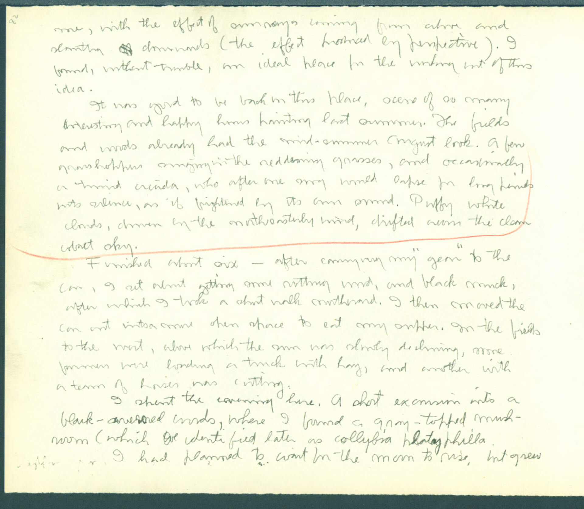 me, with the effect of sunrays coming from above and slanting downwards (the effect produced by perspective). I found, without trouble, an ideal place for working out of this idea.It was good to be back in this place, scene of so many interesting and happy hours paint last summer. The fields and woods already had the mid—summer August look. A few grasshoppers singing in the reddening grasses, and occasionally a timid cicada, who after one song would lapse for long periods into silence, if frightened by its own sound. Puffy white clouds, driven by the northeasterly wind, drifted across the clean cobalt sky.Finished about six—after carrying my “gem” to the car, I set about getting some rotting wood, and black muck, after which I took a short walk northward. I then moved the car out into a more open space to eat my supper. In the fields to the west, above which the sun was slowly declining, some farmers were loading a truck with hay, and another with a team of horses was cutting.I spent the evening here. A short excursion into a black—caverned weeds, where I found a gray-topped mushroom (which we identified later as collybis platyphilla.I had planned to wait for the moon to rise, but grew