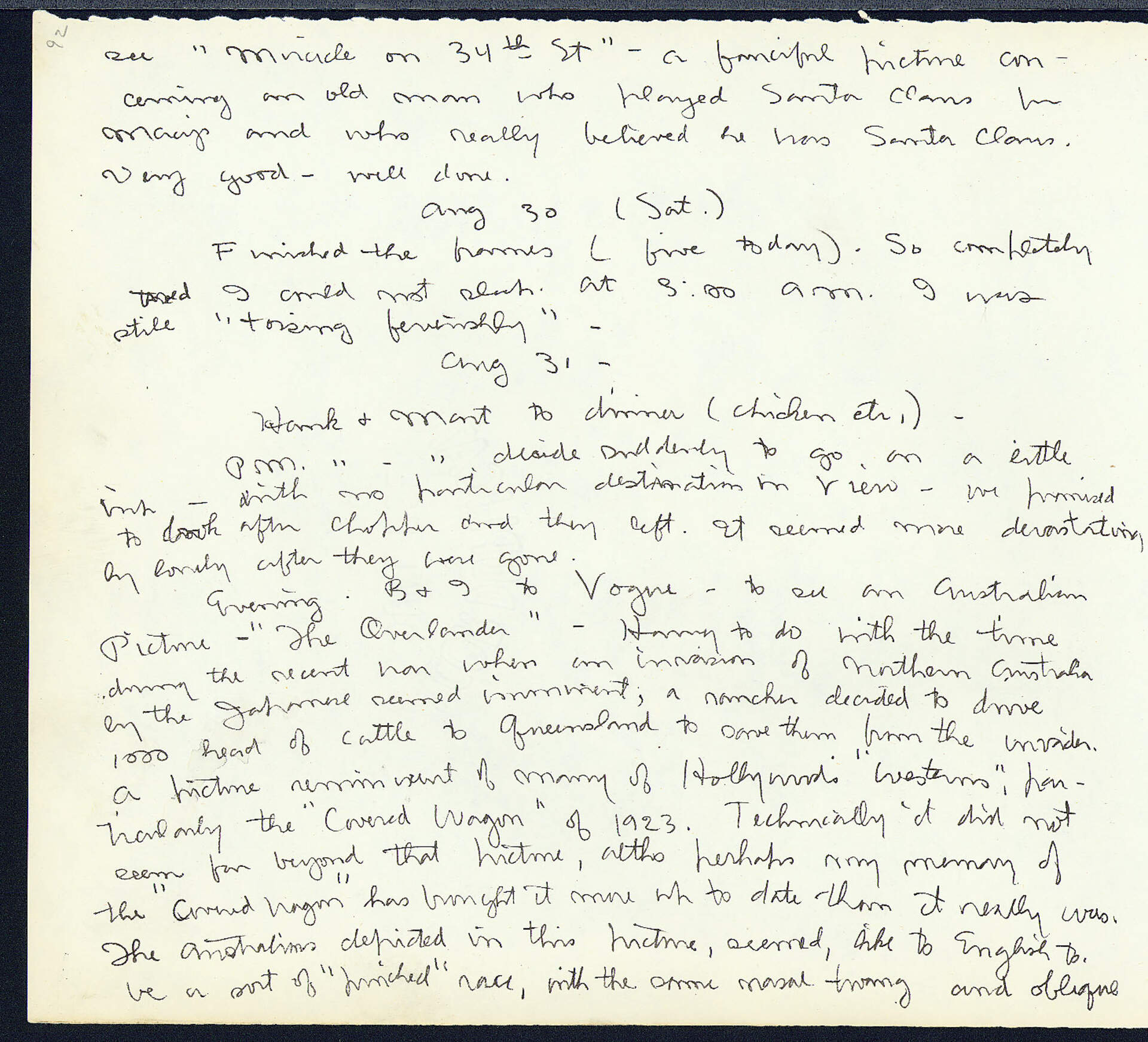 see “Miracle on 34th St”—a fanciful picture concerning an old man who played Santa Claus for Macy’s and who really believed he was Santa Claus. Very good—well done.; ; ; ; ; Aug 30 (Sat.); Finished the frames (five today). So completely tired I could not sleep. At 3:00 A.M. I was still “tossing feverishly”—; ; ; ; ; Aug 31—; Hank & Mart to dinner (chicken etc.)—; P.M. “ – “ decide suddenly to go on a little trip—with no particular destination in view—we promised to look after Chopper and they left. It seemed more devastatingly lonely after they were gone.; Evening—B & I to Vogue—to see an Australian Picture—“The Overlanders”—Having to do with the time during the recent war when an invasion of Northern Australia by the Japanese seemed imminent; a rancher decided to drive 1000 head of cattle to Queensland to save them from the invader. A picture reminiscent of many of Hollywood’s “Westerns,” particularly the “Covered Wagon” of 1923. Technically it did not seem far beyond that picture, altho perhaps my memory of the “Covered Wagon” has brought it more up to date than it really was. The Australians depicted in this picture, seemed, like to English to be a sort of “pinched” race, with the same nasal twang and oblique