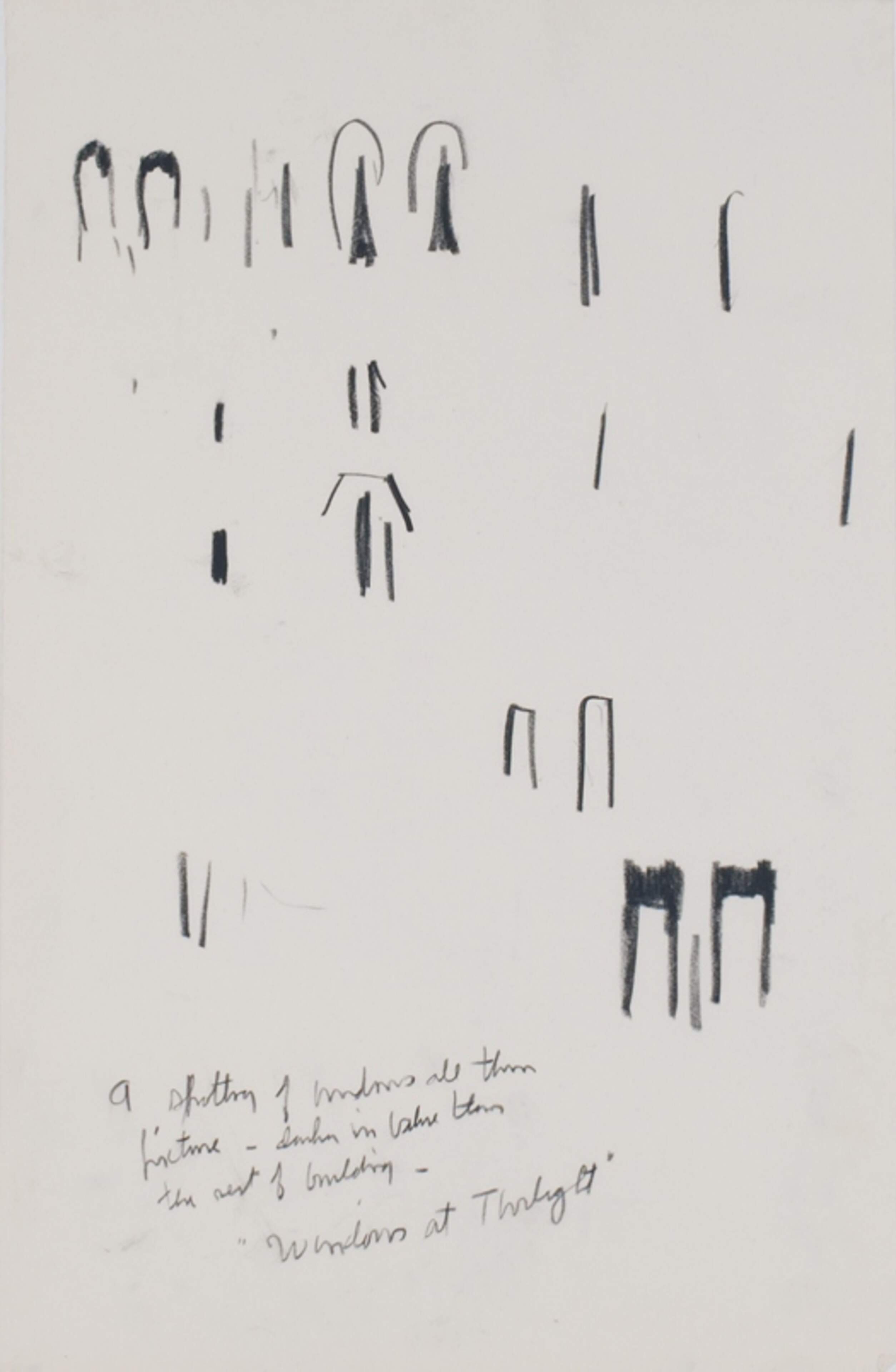 “A spotting of windows all thru picture – darker in value than the rest of building – Windows at Twilight”